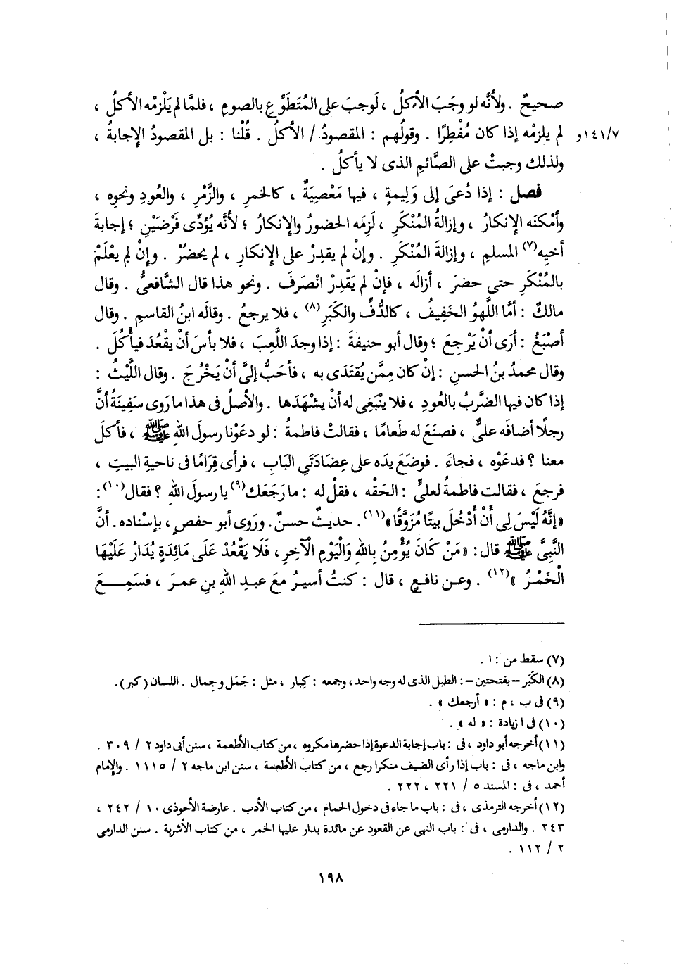 فصل: إذا دُعىَ إلى وَلِيمةٍ، فيها مَعْصِيَةٌ، كالخمرِ، والزَّمْرِ، والعُودِ ونحوِه، وأمْكنَه الإِنكارُ، وإزالةُ المُنْكَرِ، لَزِمَه الحضورُ والإِنكارُ؛ لأنَّه يُؤدِّى فَرْضَيْنِ؛ إجابةَ أخيه (٧) المسلمِ، وإزالةَ المُنْكَرِ. وإِنْ لم يقدِرْ على الإِنكارِ، لم يحضُرْ. وإِنْ لم يعْلَمْ بالمُنْكَرِ حتى حضرَ، أزالَه، فإنْ لم يَقْدِرْ انْصَرفَ. ونحو هذا قال الشَّافعىُّ. وقال مالك: أمَّا اللَّهوُ الخَفِيفُ، كالدُّفِّ والكَبَرِ (٨)، فلا يرجعُ. وقالَه ابنُ القاسمِ. وقال أصْبَغُ: أررى أنْ يَرْجِعَ؛ وقال أبو حنيفةَ: إذا وجدَ اللَّعِبَ، فلا بأسَ أنْ يقْعُدَ فيأْكُلَ. وقال محمدُ بنُ الحسنِ: إنْ كان مِمَّن يُقتَدَى به، فأحَبُّ إلىَّ أنْ يَخْرُجَ. وقال اللَّيْثُ: إذا كان فيها الضَّربُ بالعُودِ، فلا ينْبَغِى له أنْ يشْهَدَها. والأصلُ فى هذا ما رَوى سَفِينَةُ أنَّ رجلًا أضافَه علىٌّ، فصنَعَ له طَعامًا، فقالتْ فاطمةُ: لو دعَوْنا رسولَ اللَّهِ -صلى اللَّه عليه وسلم-، فأكلَ معنا؟ فدعَوْه، فجاءَ. فوضَعَ يدَه على عِضَادَتَى البَابِ، فرأى قِرَامًا فى ناحيةِ البيتِ، فرجعَ، فقالت فاطمةُ لعلىٍّ: الحَقْه، فقلْ له: ما رَجَعَك (٩) يا رسولَ اللَّهِ؟ فقال (١٠): "إنَّهُ لَيْسَ لِى أَنْ أَدْخُلَ بيتًا مُزَوَّقًا" (١١). حديثٌ حسنٌ. ورَوى أبو حفصٍ، بإسْناده. أَنَّ النَّبِىَّ -صلى اللَّه عليه وسلم- قال: "مَنْ كَانَ يُؤْمِنُ بِاللَّهِ وَالْيَوْمِ الْآخِرِ، فَلَا يَقْعُدْ عَلَى مَائِدَةٍ يُدَارُ عَلَيْهَا الْخَمْرُ" (١٢). وعن نافعٍ، قال: كنتُ أسيرُ معَ عبدِ اللَّهِ بنِ عمرَ، فسَمِعَ