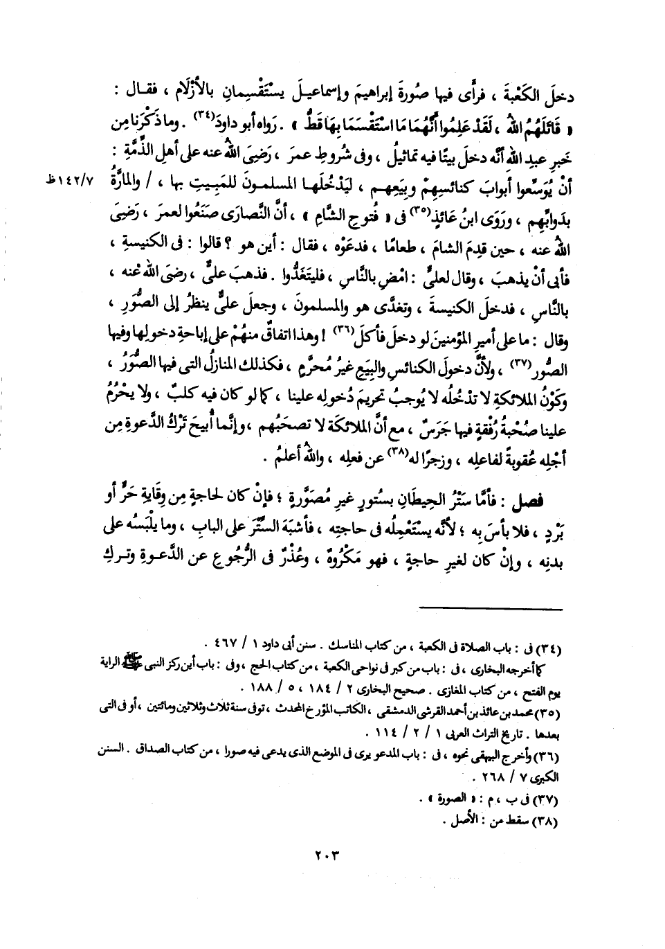 دخلَ الكَعْبةَ، فرأَى فيها صُورةَ إبراهيمَ وإسماعيلَ يسْتَقْسِمانِ بالأَزْلَام، فقال: "قَاتَلَهُمُ اللَّهُ، لَقَدْ عَلِمُوا أنَّهُمَا مَا اسْتَقْسَمَا بِهَا قَطٌّ". رَواه أبو داودَ (٣٤). وما ذَكْرَنا مِن خَبرِ عبدِ اللَّهِ أنَّه دخلَ بيتًا فيه تماثيلُ، وفى شُروطِ عمرَ، رَضِىَ اللَّهُ عنه على أهلِ الذِّمَّةِ: أَنْ يُوَسِّعوا أَبوابَ كنائسِهِمْ وبِيَعِهم، ليَدْخُلَها المسلمونَ للمَبِيتِ بها، والمارَّةُ بدَوابِّهِم، ورَوَى ابنُ عَائذٍ (٣٥) فى "فُتوحِ الشَّام"، أَنَّ النَّصارَى صَنَعُوا لعمرَ، رَضِىَ اللَّهُ عنه، حين قدِمَ الشامَ، طعامًا، فدعَوْه، فقال: أين هو؟ قالوا: فى الكنيسةِ، فأبى أَنْ يذهبَ، وقال لعلىٍّ: امْضِ بالنَّاس، فليتَغَدُّوا. فذهبَ علىٌّ، رضىَ اللَّه عنه، بالنَّاسِ، فدخلَ الكنيسةَ، وتغذَّى هو والمسلمونَ، ليجعلَ علىٌّ ينظُر إلى الصُّوَرِ، وقال: ما على أميرِ المؤمنينَ لو دخلَ فأكلَ (٣٦)! وهذا اتفاقٌ منهُمْ على إباحةِ دخولِها وفيها الصُّور (٣٧)، ولأنَّ دخولَ الكنائسِ والبِيَعِ غيرُ مُحرَّمٍ، فكذلك المنازلُ التى فيها الصُّوَرُ، وكَوْنُ الملائكةِ لا تدْخُلُه لا يُوجبُ تحريمَ دُخولِه علينا، كما لو كان فيه كلبٌ، ولا يحْرُمُ علينا صُحْبةُ رُفْقةٍ فييه جَرَسٌ، مع أَنَّ الملائكَة لا تصحَبُهم، وإنَّما أُبيحَ تَرْكُ الدَّعوةِ مِن أجْلِه عُقوبةً لفاعلِه، وزجرًا له (٣٨) عن فعلِه، واللَّهُ أعلمُ.