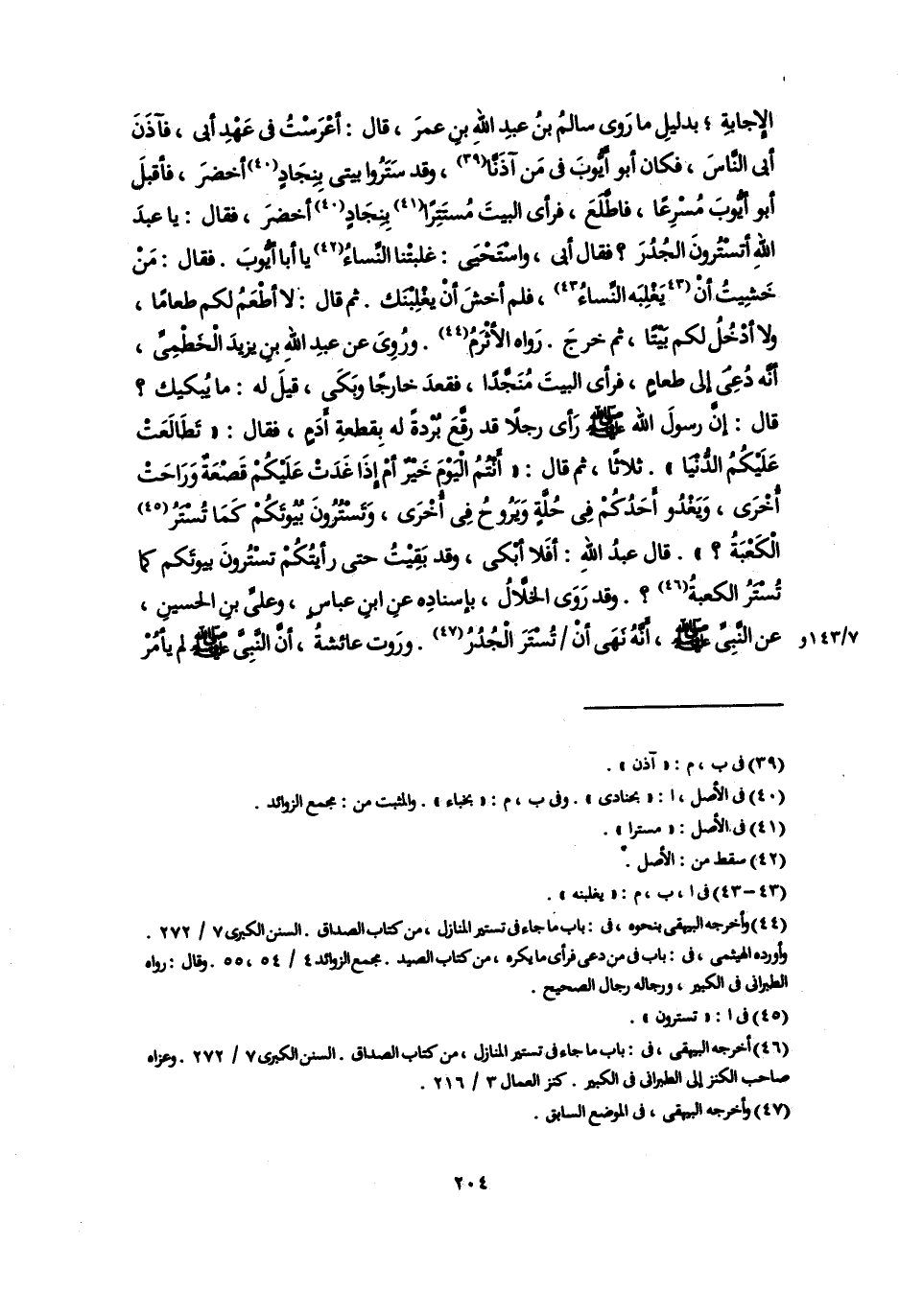 الإِجابةِ، بدليلِ ما رَوى سالمُ بن عبدِ اللَّه بن عمرَ، قال: أعْرَسْتُ فى عَهْدِ أبى، فآذَنَ أبى النَّاسَ، فكان أبو أيُّوبَ فى مَن آذَنًّا (٣٩)، وقد سَتَرُوا بيتى بِنِجَادٍ (٤٠) أخضرَ، فأقبلَ أبو أيُّوبَ مُسْرِعًا، فاطَّلَعَ، فرأى البيتَ مُستَتِرًا (٤١) بِنجَادٍ (٤٠) أخضرَ، فقال: يا عبدَ اللَّه أتسْتُرون الجُدُرَ؟ فقال أبى، واسْتَحْيَى: غلبتْنا النِّساءُ (٤٢) يا أبا أيُّوبَ. فقال: مَنْ خَشِيتُ. أن [يَغْلِبَه النِّساءُ] (٤٣)، فلم أخشَ أَنْ يغْلِبْنَك. ثم قال: لا أطْعَمُ لكم طعامًا، ولا أدْخُلُ لكم بَيْتًا، ثم خرجَ. رَواه الأَثْرَمُ (٤٤). ورُوِىَ عن عبدِ اللَّه بن يزيدَ الخَطْمِىِّ، أنَّه دُعِىَ إلى طعامٍ، فرأى البيتَ مُنَجَّدًا، فقعدَ خارجًا وبَكَى، قيلَ له: ما يُبكيك؟ قال: إنَّ رسولَ اللَّه -صلى اللَّه عليه وسلم- رَأى رجلًا قد رقَّعَ بردةً له بِقطعةِ أَدَمٍ، فقال: "تطَالَعَتْ عَلَيْكُمُ الدُّنْيَا". ثلاثًا، ثم قال: "أَنْتُمُ الْيَوْمَ خَيْرٌ أَمْ إِذَا غَدَتْ عَلَيْكُمْ قَصْعَةٌ وَرَاحَتْ أُخْرَى، وَيَغْدُو أَحَدُكُمْ فِى حُلَّةٍ وَيَرُوحُ فِى أُخْرَى، وَتَسْتُرُونَ بُيُوتَكُمْ كَمَا تُسْتَرُ (٤٥) الْكَعْبَةُ؟ ". قال عبدُ اللَّهِ: أفَلا أبْكى، وقد بَقِيْتُ حتى رأيتُكمْ تسْتُرونَ بيوتَكم كما تُسْتَرُ الكعبةُ (٤٦)؟ . وقد رَوَى الخلَّالُ، بإسنادِه عن ابن عباسٍ، وعلىِّ بن الحسينِ، عن النَّبِىِّ -صلى اللَّه عليه وسلم-، أَنَّهُ نَهَى أَنْ تُسْتَرَ الْجُدُرُ (٤٧). ورَوت عائشةُ، أَنَّ النَّبِىِّ -صلى اللَّه عليه وسلم- لم يأمُرْ