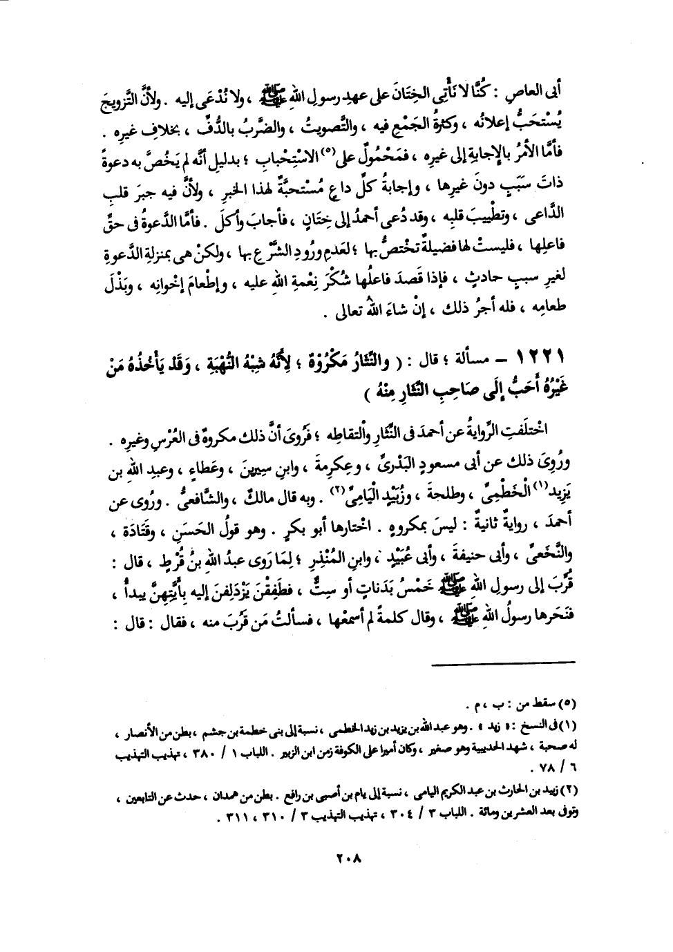 اخْتلَفتِ الرِّوايةُ عن أحمدَ فى النِّثَارِ والْتقاطِه؛ فرُوىَ أَنَّ ذلك مكروهٌ فى العُرْس وغيرِه. ورُوِىَ ذلك عن أبى مسعودٍ البَدْرىِّ، وعِكرِمةَ، وابنِ سِيرينَ، وعَطاءٍ، وعبدِ اللَّهِ بن يَزِيد (١) الْخَطْمِىِّ، وطلحةَ، وزُبَيْدٍ الْيَامِىِّ (٢). وبه قال مالكٌ، والشَّافعىُّ. ورُوى عن أحمدَ، روايةٌ ثانيةٌ: ليسَ بمكروهٍ. اخْتارها أبو بكرٍ. وهو قولُ الحَسَنِ، وقَتَادَة، والنَّخَعىِّ، وأبى حنيفةَ، وأبى عُبَيْدٍ، وابن المُنْذِرِ، لِمَا رَوى عبدُ اللَّهِ بنُ قُرْطٍ، قال: قُرِّبَ إلى رسولِ اللَّهِ -صلى اللَّه عليه وسلم- خَمْسُ بَدَناتٍ أو سِتٌّ، فطَفِقْنَ يَزْدَلِفنَ إليه بِأَيَّتِهِنَّ يبدأُ، فنَحَرها رسولُ اللَّهِ -صلى اللَّه عليه وسلم-، وقال كلمةً لم أسمعْها، فسألتُ مَن قَرُبَ منه، فقال: قال: