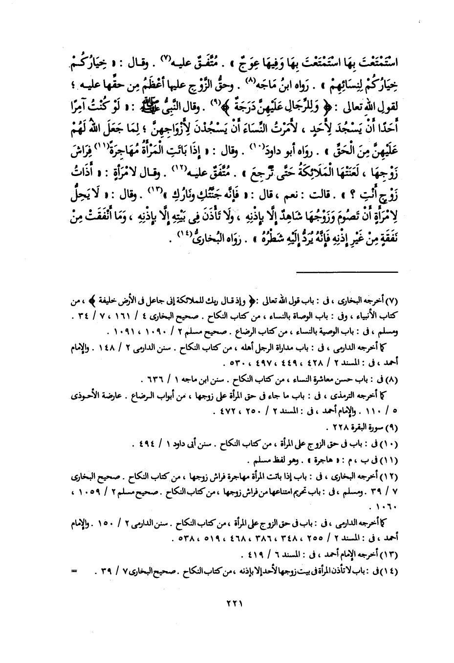 (١٢) أخرجه البخارى، فى: باب إذا باتت المرأة مهاجرة فراش زوجها، من كتاب النكاح. صحيح البخارى ٧/ ٣٩. ومسلم، فى: باب تحريم امتناعها من فراش زوجها، من كتاب النكاح. صحيح مسلم ٢/ ١٠٥٩، ١٠٦٠.