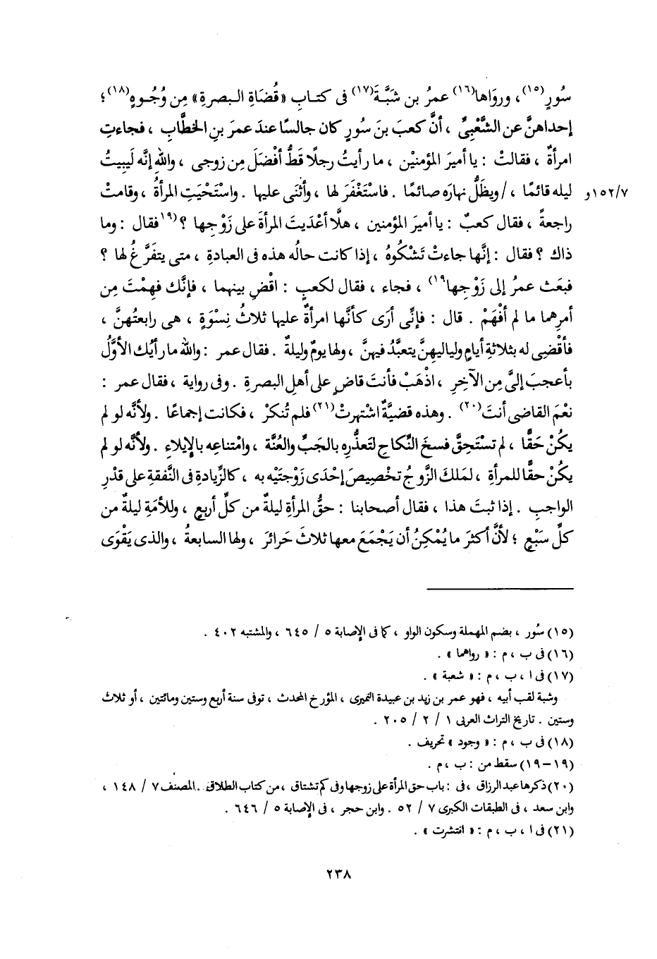سُورٍ (١٥)، وروَاها (١٦) عمرُ بن شَبَّةَ (١٧) فى كتابِ "قُضَاةِ البصرةِ" مِن وُجُوهٍ (١٨)؛ إحداهنَّ عن الشَّعْبِىِّ، أَنَّ كعبَ بنَ سُورٍ كان جالسًا عندَ عمرَ بنِ الخطَّابِ، فجاءتِ امرأةٌ، فقالتْ: يا أميرَ المؤمنيْن، ما رأيتُ رجلًا قَطُّ أفْضَلَ مِن زوجى، واللَّهِ إنَّه لَيبِيتُ ليله قائمًا، ويظَلُّ نهارَه صائمًا. فاسْتَغْفَرَ لها، وأثنَى عليها. واسْتَحْيَتِ المرأةُ، وقامتْ راجعةً، فقال كعبٌ: يا أميرَ المؤمنين، هلَّا أعْدَيتَ المرأةَ على زَوْجِها؟ [فقال: وما ذاك؟ فقال: إنَّها جاءتْ تَشْكُوهُ، إذا كانت حالُه هذه فى العبادةِ، متى يتفَرَّغُ لها؟ فبعَث عمرُ إلى زَوْجِها] (١٩)، فجاء، فقال لكعبٍ: اقْضِ بينهما، فإنَّك فهِمْتَ مِن أمرِهما ما لم أفْهَمْ. قال: فإنِّى أرَى كأنَّها امرأةٌ عليها ثلاثُ نِسْوَةٍ، هى رابعتُهنَّ، فأقْضِى له بثلاثةِ أيامٍ ولياليهِنَّ يتعبَّدُ فيهنَّ، ولها يومٌ وليلةٌ. فقال عمر: واللَّهُ ما رأيُك الأوَّلُ بأعجبَ إلىَّ مِن الآخِرِ، اذْهَبْ فأنتَ قاضٍ على أهلِ البصرةِ. وفى رواية، فقال عمر: نعْمَ القاضى أنتَ (٢٠). وهذه قضيَّةٌ اشْتهرتْ (٢١) فلم تُنكرْ، فكانت إجماعًا. ولأنَّه لو لم يكُنْ حَقًّا، لم تسْتَحِقَّ فسخَ النِّكاحِ لتَعذُّرِه بالجَبِّ والعُنَّة، وامْتناعِه بالإِيلاءِ. ولأنَّه لو لم يكُنْ حقًّا للمرأةِ، لمَلكَ الزَّوجُ تخْصِيصَ إحْدَى زَوْجتَيْه به، كالزِّيادةِ فى النَّفقةِ على قدْرِ الواجبِ. إذا ثبتَ هذا، فقال أصحابنا: حقُّ المرأةِ لَيْلَةٌ من كلِّ أربعٍ، وللأمَةِ لَيْلَةٌ من كلِّ سَبْعٍ؛ لأنَّ أكثرَ ما يُمْكِنُ أن يَجْمَعَ معها ثلاثَ حَرائرَ، ولها السابعةُ، والذى يَقْوَى
