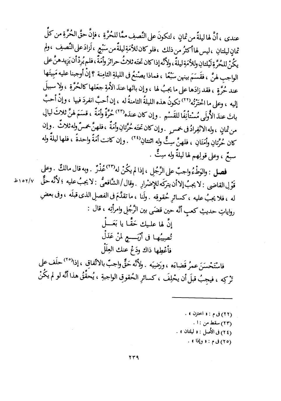 عندى، أَنَّ لها ليلةً من ثمانٍ، لتكونَ على النِّصفِ ممَّا للحُرَّةِ، فإنَّ حقَّ الحُرَّةِ من كلِّ ثمانٍ ليلتانِ، ليس لها أكثرُ من ذلك، فلو كان للأمَةِ لَيْلَةٌ من سَبْعٍ، لَزادَ على النِّصفِ، ولم يكُنْ للحُرَّةِ لَيْلتانِ وللأمَةِ لَيْلَةٌ، ولأنَّه إذا كان تحتَه ثلاثُ حرائرَ وأمَةٌ، فلم يُرِدْ أن يَزِيدهنَّ على الواجبِ لهنَّ، فقَسَمَ بيهن سَبْعًا، فماذا يصْنعُ فى الليلةِ الثامِنة؟ إنْ أوجبنا عليه مَبِيتَها عند حُرَّةٍ، فغد زادَها على ما يجبُ لها، وإن باتَها عندَ الأمةِ جعَلها كالحُرَّةِ، ولا سبيلَ إليه، وعلى ما اخْتَرْتُه (٢٢) تكونُ هذه الليلةُ الثامنةُ له، إن أحبَّ انفردَ فيها، وإِنْ أحبَّ باتَ عندَ الأُولَى مُسْتأنِفًا للقَسْمِ. وإن كان عندَه (٢٣) حُرَّةٌ وأمَةٌ، قسَمَ لهنَّ ثلاثَ ليالٍ من ثمانٍ، وله الانْفِرادُ فى خمسٍ. وإن كان تحتَه حُرَّتانِ وأمَةٌ، فلهنَّ خمسٌ وله ثلاثٌ. وإن كان حُرَّتانِ وأُمتَانِ، فلهنَّ سِتٌّ وله اثنتانِ (٢٤). وإن كانت أمَةً واحدةً، فلها لَيْلَةٌ وله سبعٌ، وعلى قولِهم لها لَيْلَةٌ وله سِتٌّ.