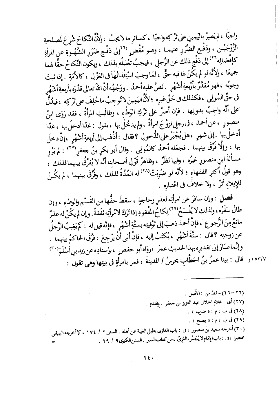 فصل: وإن سافرَ عن امرأتِه لعذرٍ وحاجةٍ، سقطَ حقُّها من القَسْمِ والوطءِ، وإن طالَ سَفَرُه، ولذلك لا يُفْسَخُ (٢٩) نِكاحُ المفْقودِ إذا تَرَكَ لامْرأتِه نَفَقةً. وإن لم يكُنْ له عذرٌ مانعٌ مِن الرُّجوعِ، فإنَّ أحمدَ ذهبَ إلى تَوْقيتِه بستَّةِ أشْهُرٍ، فإنَّه قيل له: كم يَغِيبُ الرَّجلُ عن زوجتِه؟ قال: ستَّةَ أشْهُرٍ، يُكتَبُ إليه، فإنْ أبَى أَنْ يرْجِعَ، فرَّقَ الحاكمُ بينهما. وإنَّما صَارَ إلى تقديرِه بهذا لحديثِ عمرَ، روَاه أبو حفصٍ، بإسنادِه عن زيد بنِ أسْلَمَ (٣٠) قال: بينا عمرُ بنُ الخطَّابِ يحرسُ المدينةَ، فمر بامرأةٍ فى بيتِها وهى تقول: