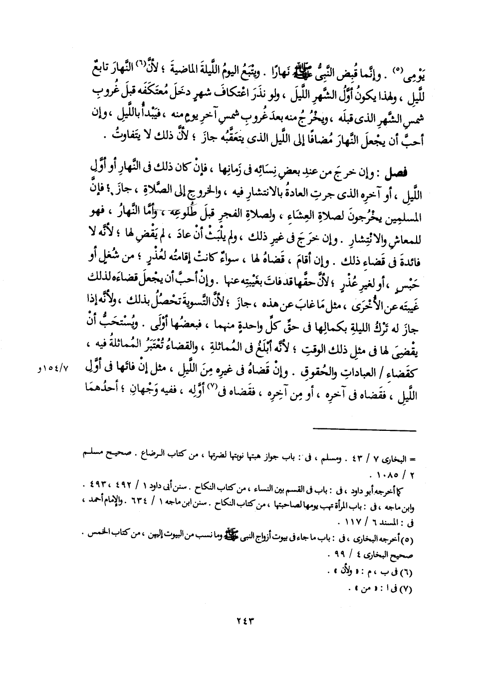 فصل: وإن خرجَ من عندِ بعض نِسَائِه فى زَمانِها، فإنْ كان ذلك فى النَّهارِ أو أوَّلَ اللَّيلِ، أو آخرِه الذى جرتِ العادةُ بالانتشارِ فيه، والخروجِ إلى الصَّلاةِ، جازَ؛ فإنَّ المسلمِين يخْرُجونَ لصلاةِ العِشَاءِ، ولصلاةِ الفجرِ قبلَ طُلوعِه، وأمَّا النَّهارُ، فهو للمعاشِ والانْتِشارِ. وإن خرَجَ فى غيرِ ذلك، ولم يلْبَثْ أَنْ عادَ، لم يَقْضِ لها؛ لأنَّه لا فائدةَ فى قَضاءِ ذلك. وإن أقامَ، قَضاهُ لها، سواءٌ كانتْ إقامتُه لعُذْرٍ؛ من شُغلٍ أو حَبْسٍ، أو لغيرِ عُذْرٍ؛ لأنَّ حقَّها قد فاتَ بغَيْبتِه عنها. وإِنْ أحبَّ أن يجْعلَ قضاءَه لذلك غَيبتَه عن الأُخْرَى، مثل مَا غابَ عن هذه، جازَ؛ لأنَّ التَّسويةَ تحْصُلُ بذلك، ولأنَّه إذا جازَ له تَرْكُ الليلةِ بكمالِها فى حقِّ كلِّ واحدةٍ منهما، فبعضُها أوْلَى. ويُسْتحَبُّ أَنْ يقْضِىَ لها فى مثلِ ذلك الوقتِ؛ لأنَّه أبْلَغُ فى المُماثلةِ، والقضاءُ تُعْتَبَرُ المُماثلةُ فيه، كقَضاءِ العباداتِ والحُقوقِ. وإِنْ قَضاهُ فى غيرِه مِنَ اللَّيلِ، مثل إنْ فاتَها فى أَوَّلِ اللَّيلِ، فقَضاه فى آخرِه، أو مِن آخِرِه، فقَضاه فى (٧) أوَّلِه، ففيه وَجْهانِ؛ أحدُهمَا
