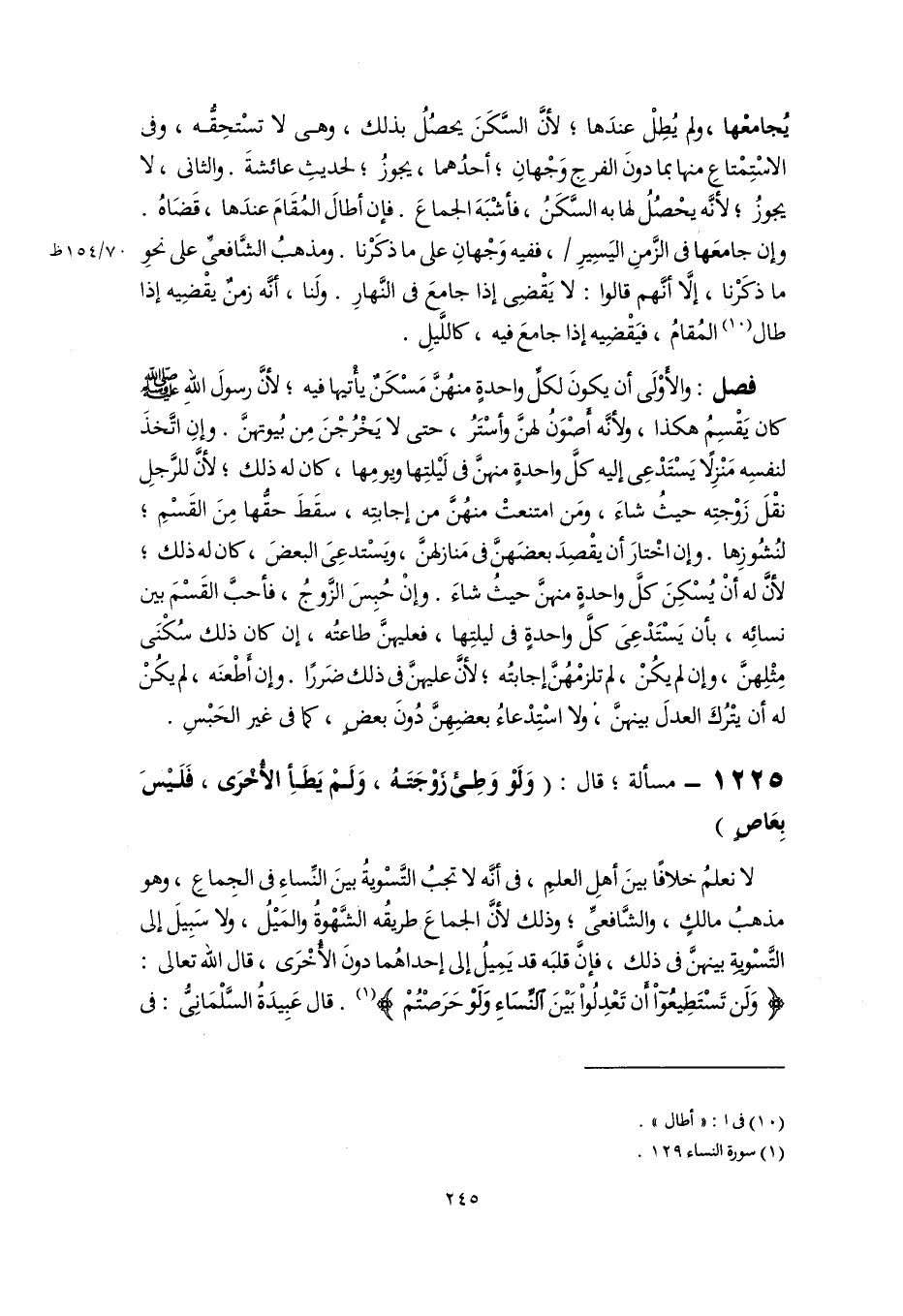يُجامعْها، ولم يُطِلْ عندَها؛ لأنَّ السَّكَنَ يحصُلُ بذلك، وهى لا تسْتحِقُّه، وفى الاسْتِمْتاعِ منها بما دونَ الفرجِ وَجْهانِ؛ أحدُهما، يجوزُ؛ لحديثِ عائشةَ. والثانى، لا يجوزُ؛ لأنَّه يحْصُلُ لها به السَّكَنُ، فأشْبَهَ الجماعَ. فإن أطالَ المُقَامَ عندَها، قَضَاهُ. وإن جامعَها فى الزَّمنِ اليَسِيرِ، ففيه وَجْهانِ على ما ذكَرْنا. ومذهبُ الشَّافعىِّ على نحوِ ما ذكَرْنا، إلَّا أنَّهم قالوا: لا يَقْضِى إذا جامعَ فى النَّهارِ. ولَنا، أنَّه زمنٌ يقْضِيه إذا طال (١٠) المُقامُ، فيَقْضِيه إذا جامعَ فيه، كاللَّيلِ.