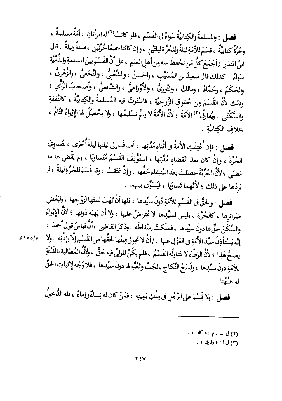 فصل: والمسلمةُ والكِتابيَّةُ سَواءٌ فى القَسْمِ، فلو كانتْ (٢) له امرأتانِ، أمَةٌ مسلمةٌ، وحُرَّةٌ كتابيَّةٌ، قسَمَ للأمَةِ ليلةً وللحُرَّةِ ليلتَيْنِ، وإن كانَتا جميعًا حُرَّتَيْنِ، فليلةٌ وليلةٌ. قال ابنُ المنذرِ: أجْمَعَ كلُّ مَن نحْفظُ عنه مِن أهلِ العلمِ، على أَنَّ القَسْمَ بينَ المسلمةِ والذِّمِّيَّةِ سَواءٌ. كذلك قال سعيدُ بن المُسَيَّبِ، والحسنُ، والشَّعْبِىُّ، والنَّخَعىُّ، والزُّهْرىُّ، والحَكَمُ، وحَمَّادُ، ومالكٌ، والثَّورىُّ، والأوْزاعىُّ، والشَّافعىُّ، وأصحابُ الرَّأْىِ، وذلك لأنَّ القَسْمَ مِن حُقوقِ الزَّوجِيَّةِ، فاسْتَوتْ فيه المُسلمةُ والكِتابيَّةُ، كالنَّفقةِ والسُّكْنَى. ويُفارقُ (٣) الأمَةَ؛ لأنَّ الأمَةَ لا يتمُّ تسْليمُها، ولا يحْصُلُ لها الإِيواءُ التَّامُّ، بخلافِ الكِتابيَّةِ.