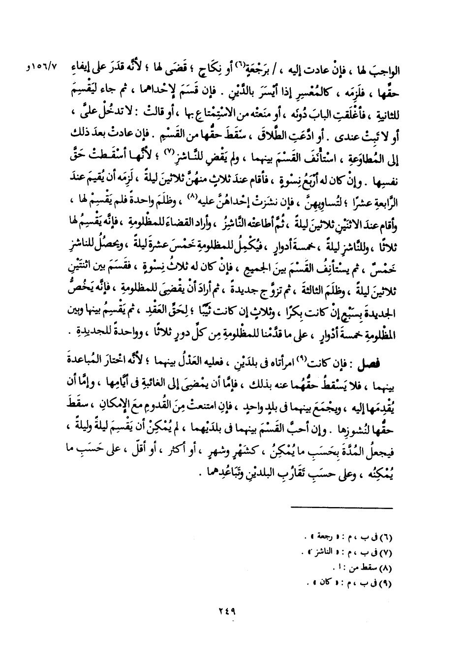 فصل: فإن كانت (٩) امرأتاه فى بلدَيْنِ، فعليه العَدْلُ بينهما؛ لأنَّه اخْتارَ المُباعدةَ بينهما، فلا يَسْقطُ حقُّهُما عنه بذلك، فإمَّا أن يمْضِىَ إلى الغائبةِ فى أيَّامِها، وإمَّا أن يُقْدِمَها إليه، ويجْمَعَ بينهما فى بلدٍ واحدٍ، فإنِ امتنعتْ مِنَ القُدومِ معَ الإِمكانِ، سقَطَ حقُّها لنُشوزِها. وإن أحبَّ القَسْمَ بينهما فى بلدَيْهما، لم يُمْكِنْ أن يَقْسِمَ ليلةً وليلةً، فيجعلُ المُدَّةَ بِحَسَبِ ما يُمْكِنُ، كشَهْرٍ وشهرٍ، أو أكثر، أو أقلّ، على حَسَبِ ما يُمْكِنُه، وعلى حسَبِ تَقَارُبِ البلديْنِ وتَبَاعُدِهما.