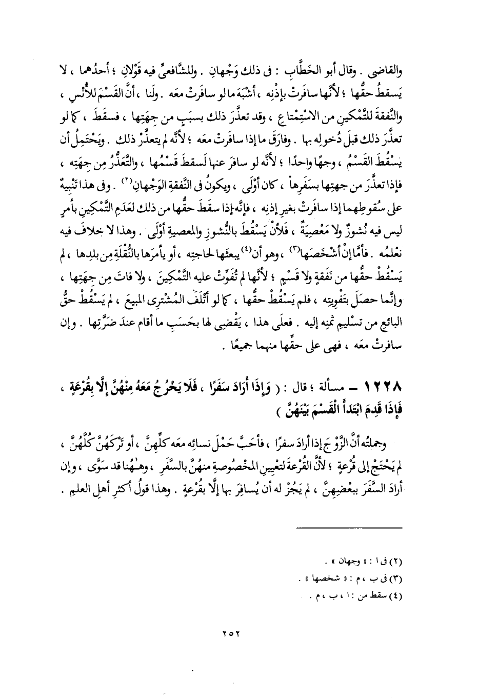 والقاضى. وقال أبو الخَطَّابِ: فى ذلك وَجْهانِ. وللشَّافعىِّ فيه قَوْلانِ؛ أحدُهما، لا يَسقطُ حقُّها؛ لأنَّها سافَرتْ بإذْنِه، أشْبَهَ ما لو سافَرتْ معَه. ولَنا، أَنَّ القَسْمَ للأُنْسِ، والنَّفقةَ للتَّمْكينِ من الاسْتِمْتاعِ، وقد تعذَّرَ ذلك بسبَبٍ من جِهَتِها، فسقَطَ، كما لو تعذَّرَ ذلك قبلَ دُخولِه بها. وفارَقَ ما إذا سافَرتْ معَه؛ لأنَّه لم يتعذَّرْ ذلك. ويَحْتَمِلُ أن يسْقُطَ القَسْمُ، وجهًا واحدًا؛ لأنَّه لو سافرَ عنها لَسقطَ قَسْمُها، والتَّعَذُّرُ مِن جِهَتِه، فإذا تعذَّرَ من جهتِها بسَفَرِها، كان أوْلَى، ويكونُ فى النَّفقةِ الوَجْهانِ (٢). وفى هذا تَنْبيهٌ على سُقوطِهما إذا سافَرتْ بغيرِ إذنِه، فإنَّه إذا سقَطَ حقُّها من ذلك لعَدَمِ التَّمْكِينِ بأمرٍ ليس فيه نُشوزٌ ولا مَعْصِيَةٌ، فَلأنْ يَسْقُطَ بالنُّشوزِ والمعصيةِ أوْلَى. وهذا لا خلافَ فيه نعْلمُه. فأمَّا إنْ أشْخَصَها (٣)، وهو أن (٤) يبعثَها لحاجتِه، أو يأمرَها بالنُّقْلَةِ مِن بلدِها، لم يَسْقُطْ حقُّها من نَفَقةٍ ولا قَسْمٍ؛ لأنَّها لم تُفَوِّتْ عليه التَّمْكِينَ، ولا فاتَ مِن جِهَتِها، وإنَّما حصَلَ بتَفْوِيتِه، فلم يَسْقُطْ حقُّها، كما لو أتْلَفَ المُشْتَرِى المبيعَ، لم يَسْقُطْ حقُّ البائعِ من تسْليمِ ثمنِه إليه. فعلَى هذا، يَقْضِى لها بحَسَبِ ما أقام عندَ ضَرَّتِها. وإن سافرتْ معَه، فهى على حقِّها منهما جميعًا.