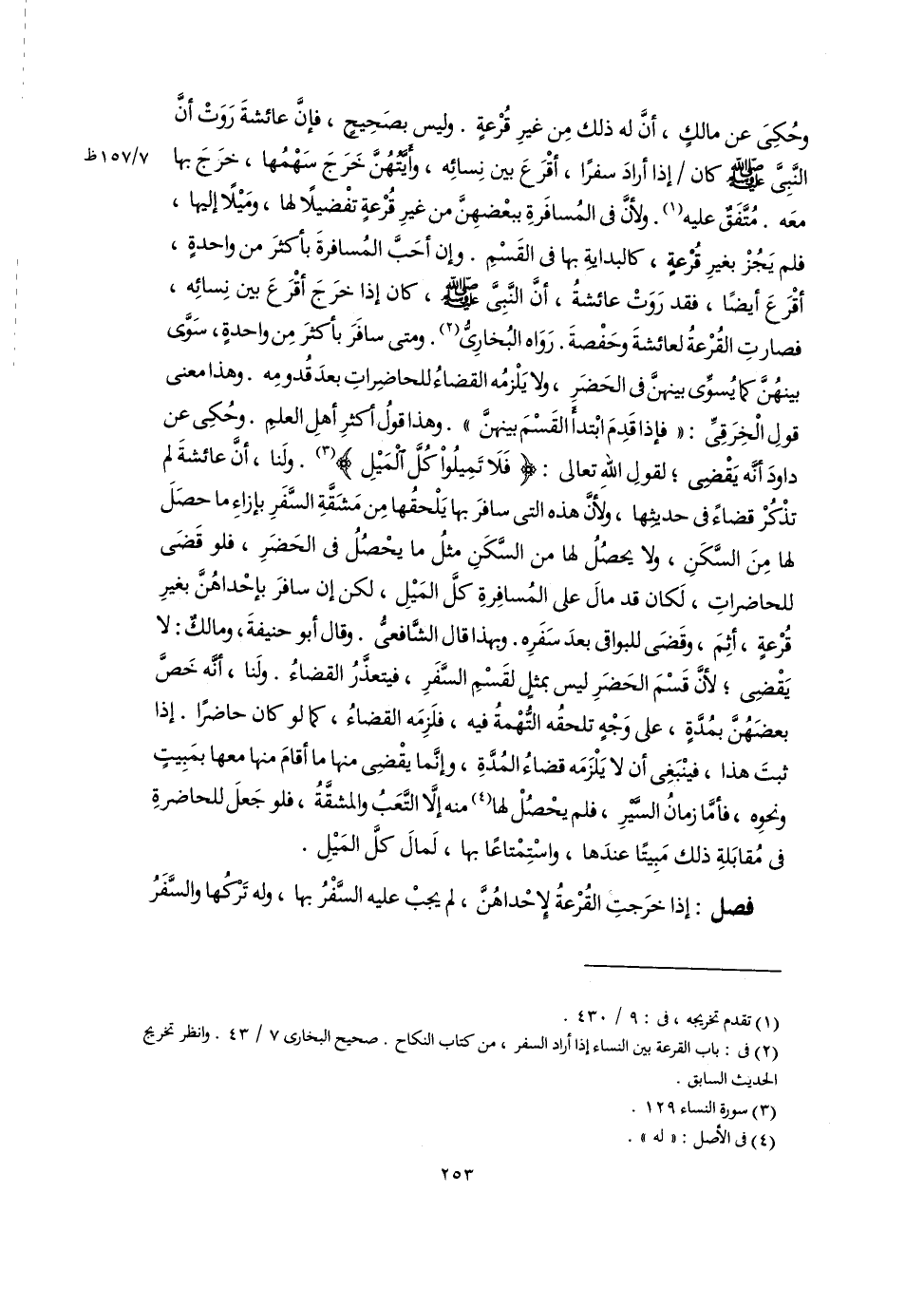 وحُكِىَ عن مالكٍ، أَنَّ له ذلك مِن غيرِ قُرْعةٍ. وليس بصَحِيحٍ، فإنَّ عائشةَ رَوَتْ أَنَّ النَّبِىَّ -صلى اللَّه عليه وسلم- كان إذا أرادَ سفرًا، أقْرَعَ بين نِسائِه، وأيَّتُهُنَّ خَرَجَ سَهْمُها، خرَجَ بها معَه. مُتَّفَقٌ عليه (١). ولأنَّ فى المُسافَرةِ ببعْضهِنَّ من غيرِ قُرْعةٍ تفْضيلًا لها، ومَيْلًا إليها، فلم يَجُزْ بغيرِ قُرْعةٍ، كالبدايةِ بها فى القَسْمِ. وإن أحَبَّ المُسافرةَ بأكثرَ من واحدةٍ، أقْرَعَ أيضًا، فقد رَوَتْ عائشةُ، أَنَّ النَّبِىَّ -صلى اللَّه عليه وسلم-، كان إذا خرَجَ أقْرَعَ بين نِسائِه، فصارتِ القُرْعةُ لعائشةَ وحَفْصةَ. رَوَاه البُخارِىُّ (٢). ومتى سافَرَ بأكثرَ مِن واحدةٍ، سَوَّى بينهُنَّ كما يُسوِّى بينهنَّ فى الحَضَرِ، ولا يَلْزمُه القضاءُ للحاضِراتِ بعدَ قُدومِه. وهذا معنى قولِ الْخِرَقِىِّ: "فإذا قَدِمَ ابْتدأَ القَسْمَ بينهنَّ". وهذا قولُ أكثرِ أهلِ العلمِ. وحُكِى عن داودَ أنَّه يَقْضِى؛ لقولِ اللَّهِ تعالى: {فَلَا تَمِيلُوا كُلَّ الْمَيْلِ} (٣). ولَنا، أَنَّ عائشةَ لم تذْكُرْ قضاءً فى حديثِها، ولأنَّ هذه التى سافرَ بها يَلْحقُها مِن مَشَقَّةِ السَّفَرِ بإزاءِ ما حصَلَ لها مِنَ السَّكَنِ، ولا يحصُلُ لها من السَّكَنِ مثلُ ما يحْصُلُ فى الحَضَرِ، فلو قَضَى للحاضراتِ، لَكان قد مالَ على المُسافِرةِ كلَّ المَيْلِ، لكن إن سافرَ بإحْداهُنَّ بغيرِ قُرْعةٍ، أثِمَ، وقَضَى للبواقى بعدَ سَفَرِه. وبهذا قال الشَّافعىُّ. وقال أبو حنيفةَ، ومالكٌ: لا يَقْضِى؛ لأنَّ قَسْمَ الحَضَرِ ليس بمثلٍ لقَسْمِ السَّفَرِ، فيتعذَّرُ القضاءُ. وَلنا، أنَّه خَصَّ بعضَهُنَّ بمُدَّةٍ، على وَجْهٍ تلحقُه التُّهْمةُ فيه، فلَزِمَه القضاءُ، كما لو كان حاضرًا. إذا ثبتَ هذا، فينْبَغِى أن لا يَلْزَمَه قضاءُ المُدَّةِ، وإنَّما يقْضِى منها ما أقامَ منها معها بمَبِيتٍ ونحوِه، فأمَّا زمانُ السَّيْرِ، فلم يحْصُلْ لها (٤) منه إِلَّا التَّعَبُ والمشقَّةُ، فلو جَعلَ للحاضرةِ فى مُقابَلةِ ذلك مَبِيتًا عندَها، واسْتِمْتاعًا بها، لَمالَ كلَّ المَيْلِ.