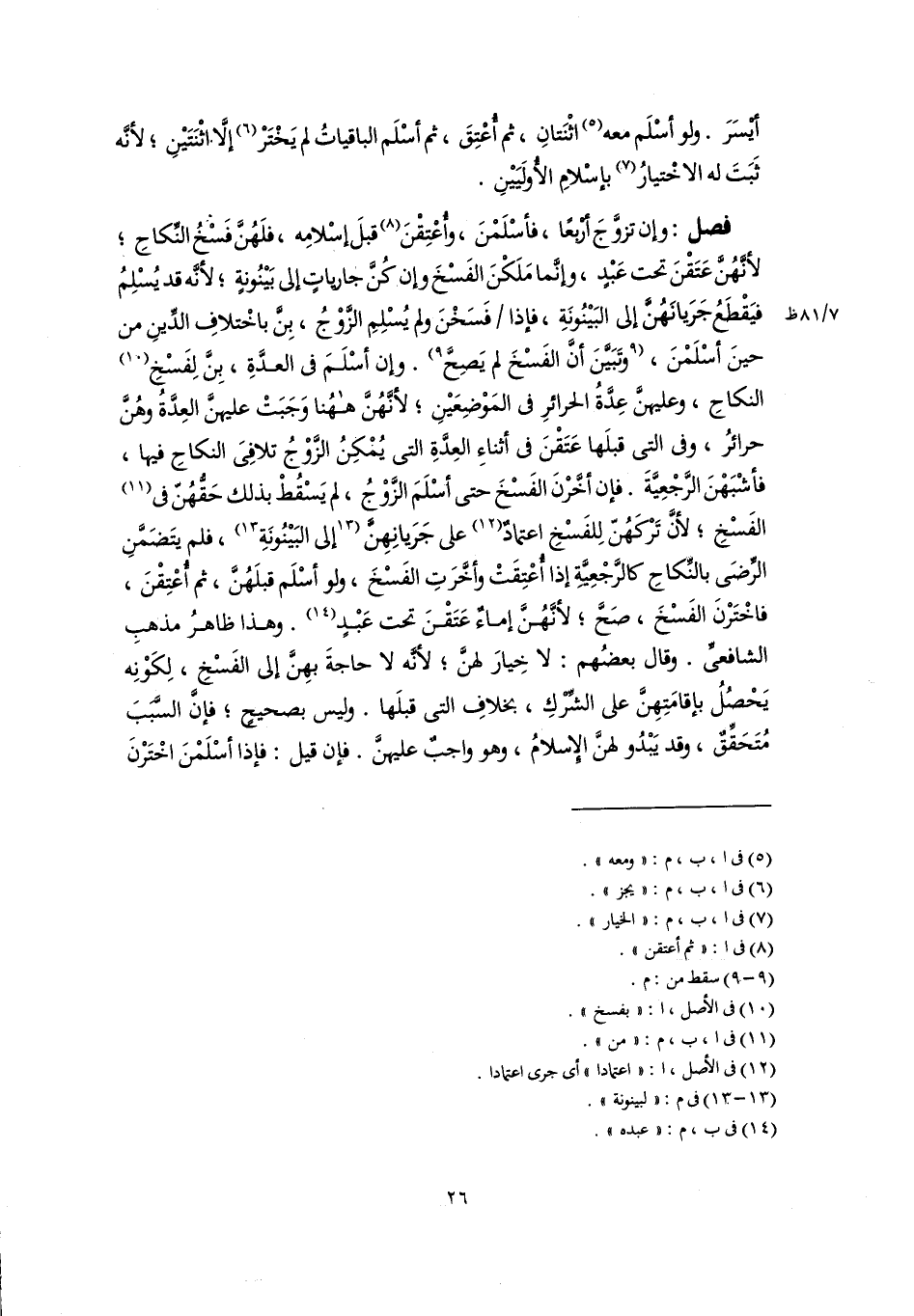 فصل: وإن تزوَّجَ أرْبعًا، فأسْلَمْنَ، وأُعْتِقْنَ (٨) قبلَ إِسْلامِه، فلَهُنَّ فَسْخُ النِّكاحِ؛ لأنَّهُنَّ عَتَقْنَ تحت عَبْدٍ، وإنَّما مَلَكْنَ الفَسْخَ وإن كُنَّ جارباتٍ إلى بَيْنُونةٍ؛ لأنَّه قد يُسْلِمُ فيَقْطعُ جَرَيانَهُنَّ إلى البَيْنُونَةِ، فإذا فَسَخْنَ ولم يُسْلِمِ الزَّوْجُ، بِنَّ باخْتلافِ الدِّينِ من حينَ أسْلَمْنَ، [وتَبَيَّنَ أَنَّ الفَسْخَ لم يَصِحَّ] (٩). وإن أسْلَمَ فى العدَّةِ، بِنَّ لِفَسْخِ (١٠) النِّكاحِ، وعليهنَّ عِدَّةُ الحرائرِ فى المَوْضِعَيْنِ؛ لأنَّهُنَّ ههنا وَجَبَتْ عليهنَّ العِدَّةُ وهُنَّ حرائرُ، وفى التى قبلَها عَتَقْنَ فى أثناءِ العِدةِ التى يُمْكِنُ الزَّوْجُ تلافِىَ النِّكاحِ فيها، فأشْبَهْنَ الرَّجْعِيَّةَ. فإن أخرْنَ الفَسْخَ حتى أسْلَمَ الزَّوْجُ، لم يَسْقُطْ بذلك حَقُّهُنّ فى (١١) الفَسْخِ؛ لأنَّ تَرْكَهُنّ لِلفَسْخِ اعتمادٌ (١٢) على جَرَيانِهِنَّ [إلى البَيْنُونَةِ] (١٣)، فلم يتَضَمَّنِ الرَّضَى بالنِّكاحِ كالرَّجْعِيَّةِ إِذا أُعْتِقَتْ وأخَّرَتِ الفَسْخَ، ولو أسْلَم قبلَهُنَّ، ثم أُعْتِقْنَ، فاخْتَرْنَ الفَسْخَ، صَحَّ؛ لأنَّهُنَّ إماءٌ عَتَقْنَ تحت عَبْدٍ (١٤). وهذا ظاهرُ مذهبِ الشافعىِّ. وقال بعضُهم: لا خِيارَ لهنَّ؛ لأنَّه لا حاجةَ بهِنَّ إلى الفَسْخِ، لِكَوْنِه يَحْصُلُ بإقامَتِهِنَّ على الشِّرْكِ، بخلافِ التى قبلَها. وليس بصحيحٍ؛ فإنَّ السَّبَبَ مُتَحَقِّقٌ، وقد يَبْدُو لهنَّ الإِسلامُ، وهو واجبٌ عليهنَّ. فإن قيل: فإذا أسْلَمْنَ اخْتَرْنَ