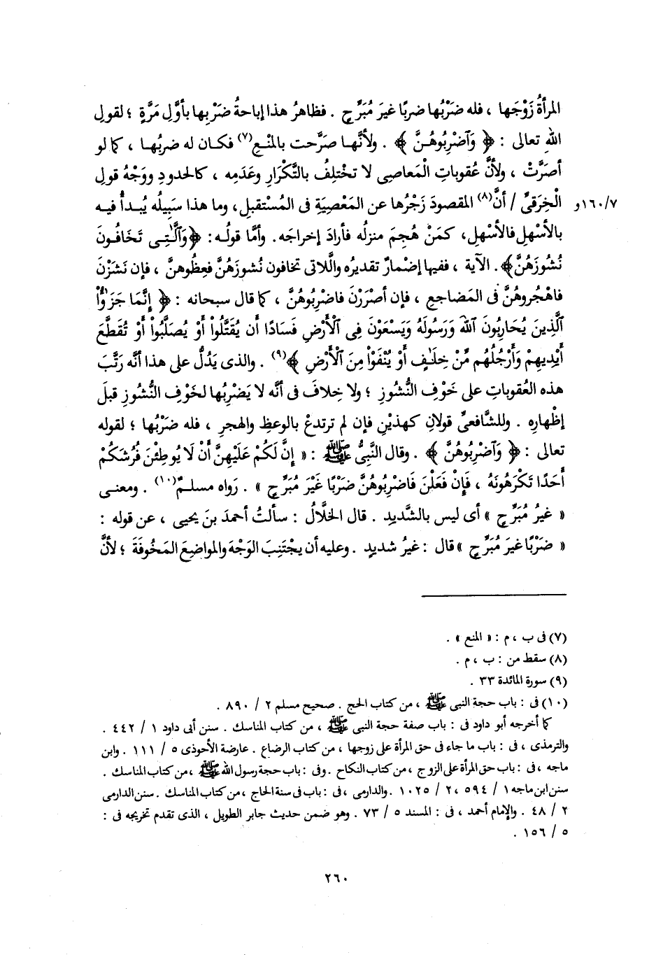 المرأةُ زَوْجَها، فله ضَرْبُها ضربًا غيرَ مُبَرِّحٍ. فظاهرُ هذا إباحةُ ضَرْبِها بأوَّلِ مَرَّةٍ؛ لقولِ اللَّهِ تعالى: {وَاضْرِبُوهُنَّ}. ولأنَّها صَرَّحت بالمنْعِ (٧) فكان له ضربُها، كما لو أصَرَّتْ، ولأنَّ عُقوباتِ الْمَعاصِى لا تخْتلِفُ بالتَّكْرَارِ وعَدَمِه، كالحدودِ ووَجْهُ قولِ الْخِرَقىِّ أَنَّ (٨) المقصودَ زَجْرُها عن المَعْصِيَةِ فى المُسْتقبلِ، وما هذا سَبِيلُه يُبدأُ فيه بالأسْهلِ فالأسْهلِ، كمَنْ هُجِمَ منزلُه فأرادَ إخراجَه. وأمَّا قولُه: {وَاللَّاتِى تَخَافُونَ نُشُوزَهُنَّ}. الآية، ففيها إضْمارٌ تقديرُه والَّلاتى تخافون نُشوزَهُنَّ فعِظُوهنَّ، فإن نَشَزْنَ فاهْجُروهُنَّ فى المَضاجعِ، فإن أصْرَرْنَ فاضْرِبُوهُنَّ، كما قال سبحانه: {إِنَّمَا جَزَاءُ الَّذِينَ يُحَارِبُونَ اللَّهَ وَرَسُولَهُ وَيَسْعَوْنَ فِى الْأَرْضِ فَسَادًا أَنْ يُقَتَّلُوا أَوْ يُصَلَّبُوا أَوْ تُقَطَّعَ أَيْدِيهِمْ وَأَرْجُلُهُمْ مِنْ خِلَافٍ أَوْ يُنْفَوْا مِنَ الْأَرْضِ} (٩). والذى يَدُلُّ على هذا أنَّه رَتَّبَ هذه العُقوباتِ على خَوْفِ النُّشُوزِ؛ ولا خِلافَ فى أنَّه لا يَضْرِبُها لخوْفِ النُّشُوزِ قبلَ إظْهارِه. وللشَّافعى قولانِ كهذيْنِ فإن لم ترتدعْ بالوعظِ والهجرِ، فله ضَرْبُها؛ لقوله تعالى: {وَاضْرِبُوهُنَّ}. وقال النَّبِىُّ -صلى اللَّه عليه وسلم-: "إنَّ لَكُمْ عَلَيْهِنَّ أَنْ لَا يُوطِئْنَ فُرُشَكُمْ أَحَدًا تَكْرَهُونَهُ، فَإِنْ فَعَلْنَ فَاضْرِبُوهُنَّ ضَرْبًا غَيْرَ مُبَرِّحٍ". رَواه مسلمٌ (١٠). ومعنى "غيرُ مُبَرِّحٍ" أى ليس بالشَّديدِ. قال الخلَّالُ: سألتُ أحمدَ بنَ يحيى، عن قوله: "ضَرْبًا غيرَ مُبَرِّحٍ" قال: غيرُ شديدٍ. وعليه أن يجْتَنِبَ الوَجْهَ والمواضِعَ المَخُوفَةَ؛ لأنَّ