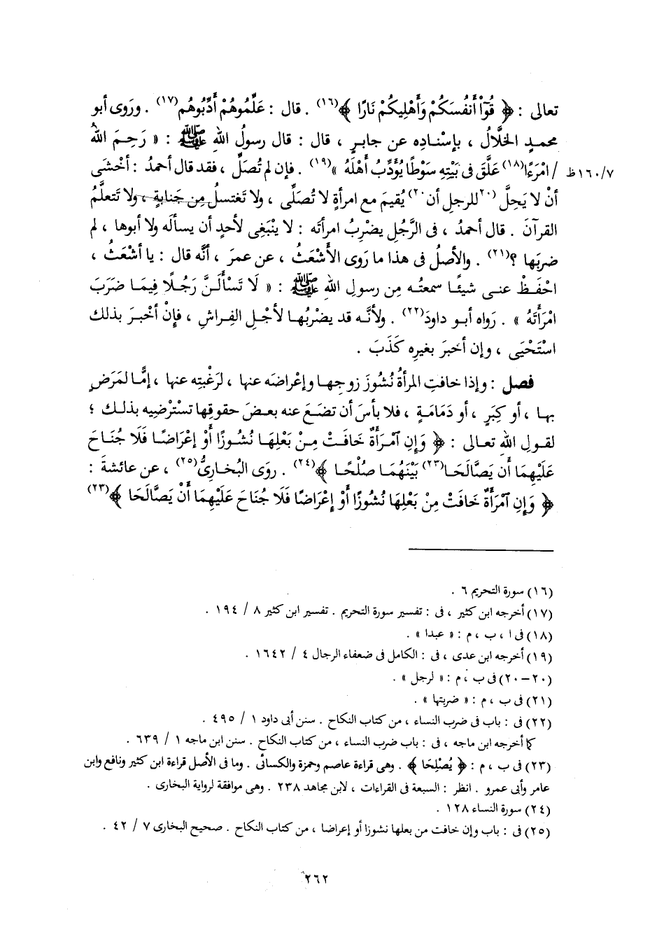 تعالى: {قُوا أَنْفُسَكُمْ وَأَهْلِيكُمْ نَارًا} (١٦). قال: عَلِّمُوهُمْ أَدِّبُوهُم (١٧). ورَوى أبو محمدٍ الخلَّالُ، بإسْنادِه عن جابرٍ، قال: قال رسولُ اللَّهِ -صلى اللَّه عليه وسلم-: "رَحِمَ اللَّهُ امْرَءًا (١٨) عَلَّقَ فى بَيْتِهِ سَوْطًا يُؤَدِّبُ أَهْلَهُ" (١٩). فإن لم تُصَلِّ، فقد قال أحمدُ: أخْشَى أَنْ لا يَحِلَّ [للرجلِ أَنْ] (٢٠) يُقيمَ مع امرأةٍ لا تُصَلِّى، ولا تَغتسلُ من جَنايةٍ، ولا تَتعلَّمُ القرآنَ. قال أحمدُ، فى الرَّجُلِ يضْرِبُ امرأتَه: لا ينْبَغِى لأحدٍ أن يسألَه ولا أبوها، لم ضرَبها؟ (٢١). والأصلُ فى هذا ما رَوى الأَشْعَثُ، عن عمرَ، أنَّه قال: يا أشْعَثُ، احْفَظْ عنى شيئًا سمعتُه مِن رسولِ اللَّهِ -صلى اللَّه عليه وسلم-: "لَا تَسْأَلَنَّ رَجُلًا فِيمَا ضَرَبَ امْرَأَتَهُ". رَواه أبو داودَ (٢٢). ولأنَّه قد يضْربُها لأجْلِ الفِراشِ، فإنْ أخْبرَ بذلك اسْتَحْيَى، وإن أخبرَ بغيرِه كَذَبَ.
