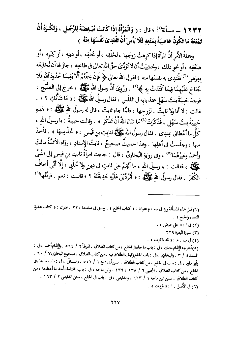 (٥) أخرجه الإِمام مالك، فى: باب ما جاء فى الخلع، من كتاب الطلاق. الموطأ ٢/ ٥٦٤. والإِمام أحمد، فى: المسند ٤/ ٣. والبخارى، فى: باب الخلع وكيف الطلاق فيه، من كتاب الطلاق. صحيح البخارى ٧/ ٦٠. وأبو داود، فى: باب فى الخلع، من كتاب الطلاق. سنن أبى داود ١/ ٥١٦. والنسائى، فى: باب ما جاء فى الخلع، من كتاب الطلاق. المجتبى ٦/ ١٣٨، ١٣٩. وابن ماجه، فى: باب المختلعة تأخذ ما أعطاها، من كتاب الطلاق. سنن ابن ماجه ١/ ٦٦٣. والدارمى، فى: باب فى الخلع، سنن الدارمى ٢/ ١٦٣.