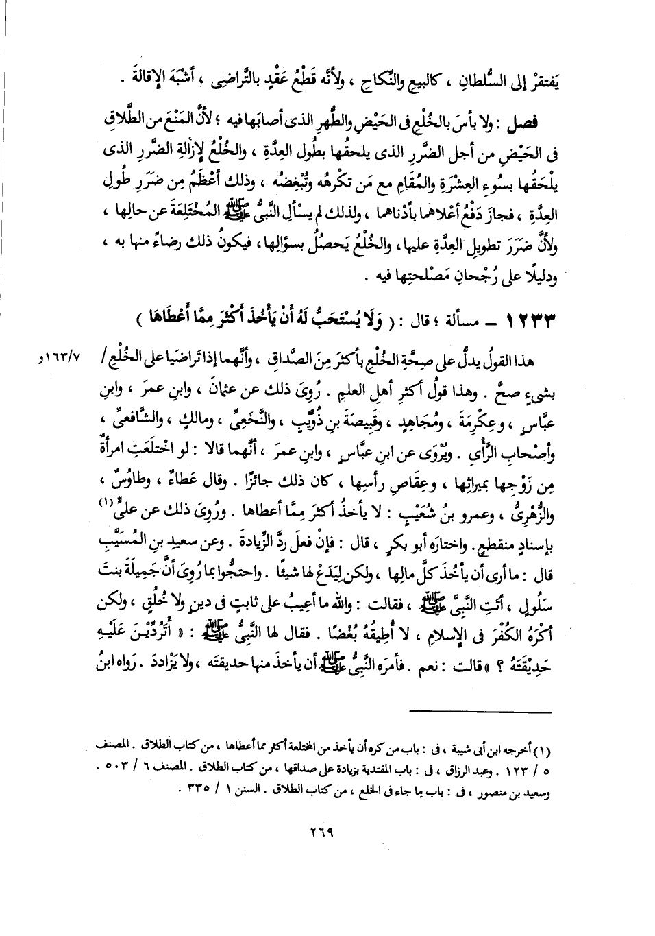 (١) أخرجه ابن أبى شيبة، فى: باب من كره أن يأخذ من المختلعة أكثر مما أعطاها، من كتاب الطلاق. المصنف ٥/ ١٢٣. وعبد الرزاق، فى: باب المفتدية بزيادة على صداقها، من كتاب الطلاق. المصنف ٦/ ٥٠٣. وسعيد بن منصور، فى: باب ما جاء فى الخلع، من كتاب الطلاق. السنن ١/ ٣٣٥.
