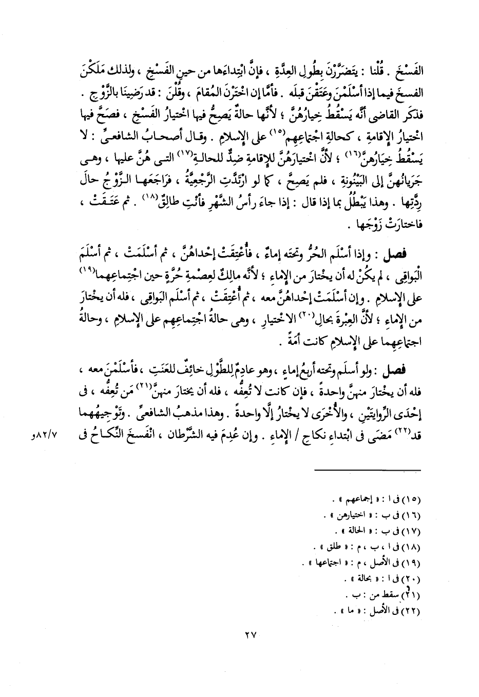 الفَسْخَ. قُلْنا: يتَضَرَّرْنَ بِطولِ العِدَّةِ، فإنَّ ابْتداءَها من حينِ الفَسْخِ، ولذلك مَلَكْنَ الفسخَ فيما إذا أسْلَمْنَ وعَتَقْنَ قبلَه. فأمَّا إن اخْتَرْنَ المُقامَ، وقُلْنَ: قد رَضِينَا بالزَّوْجِ. فذكَر القاضى أنَّه يَسْقُطُ خِيارُهُنَّ؛ لأنَّها حالةٌ يَصِحُّ فيها اخْتيارُ الفَسْخِ، فصَحَّ فيها اخْتيارُ الإِقامةِ، كحالةِ اجْتماعِهِم (١٥) على الإِسلامِ. وقال أصحابُ الشافعىِّ: لا يَسْقُطُ خِيَارُهنَّ (١٦)؛ لأنَّ اخْتيارَهُنَّ للإقامةِ ضِدٌّ للحالةِ (١٧) التى هُنَّ عليها، وهى جَرَيانُهنَّ إلى البَيْنُونةِ، فلم يَصِحَّ، كما لو ارْتَدَّتِ الرَّجْعِيَّةُ، فرَاجَعَها الزَّوْجُ حالَ رِدَّتِها. وهذا يَبْطُلُ بما إذا قال: إذا جاءَ رأسُ الشَّهْرِ فأنْتِ طالِقٌ (١٨). ثم عَتَقَتْ، فاختارَتْ زَوْجَها.