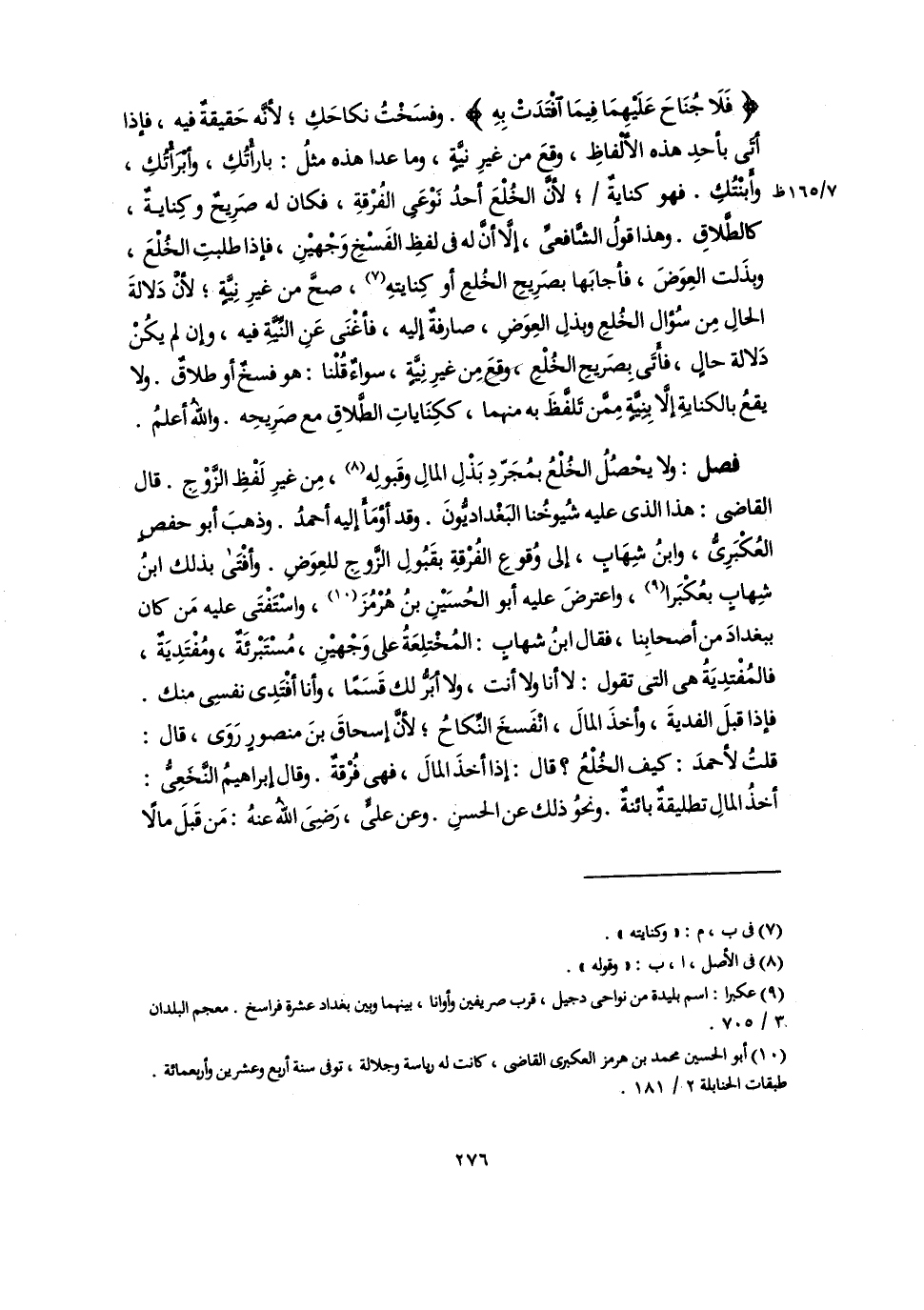 {فَلَا جُنَاحَ عَلَيْهِمَا فِيمَا افْتَدَتْ بِهِ}. وفسَخْتُ نكاحَكِ؛ لأنَّه حَقيقةٌ فيه، فإذا أتَى بأحدِ هذه الألْفاظِ، وقعَ من غيرِ نيَّةٍ، وما عدا هذه مثلُ: بارأْتُكِ، وأبْرَأْتُكِ، وأَبْنتُكِ. فهو كنايةٌ؛ لأنَّ الخُلْعَ أحدُ نَوْعَى الفُرْقةِ، فكان له صَرِيحٌ وكِنايةٌ، كالطَّلاقِ. وهذا قولُ الشَّافعىِّ، إلَّا أَنَّ له فى لفظِ الفَسْخِ وَجْهيْنِ، فإذا طلبتِ الخُلْعَ، وبذَلت العِوَضَ، فأجابَها بصَرِيحِ الخُلعِ أو كِنايتهِ (٧)، صحَّ من غيرِ نِيَّةٍ؛ لأنْ دَلالةَ الحالِ مِن سُؤال الخُلعِ وبذلِ العِوَض، صارفةٌ إليه، فأغْنَى عَنِ النِّيَّةِ فيه، وإن لم يكُنْ دَلالة حالٍ، فأَتَى بِصَريحِ الخُلْعِ وقعَ مِن غيرِ نِيَّةٍ، سواءٌ قُلْنا: هو فسخٌ أو طلاقٌ. ولا يقعُ بالكنايةِ إلَّا بِنِيَّةٍ مِمَّن تَلْفَّظَ به منهما، ككِنَاياتِ الطَّلاقِ مع صَرِيحِه. واللَّهُ أعلمُ.