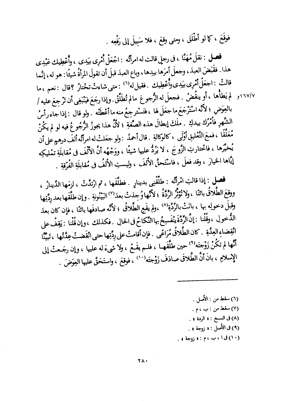 فصل: نقلَ مُهَنَّا، فى رجلٍ قالت له امرأتُه: اجْعَلْ أَمْرِى بيَدِى، وأُعْطِيك عَبْدِى هذا. فقَبَضَ العبدَ، وجعلَ أمرَها بيدِها، وباع العبدَ قبلَ أن تقولَ المرأةُ شيئًا: هو له، إنَّما قالتْ: اجعَلْ أمْرِى بيَدِى وأُعْطِيك. فقيل له (٦): متى شاءتْ تخْتارُ؟ قال: نعم، ما لم يَطأْها، أو ينقُضْ. فجعلَ له الرُّجوعَ ما لم تُطَلِّقْ. وإذارجَعَ فيَنْبَغِى أن تَرْجِعَ عليه بالعِوَضِ؛ لأنَّه اسْتَرْجَعَ ما جعَلَ لها، فتَسْترجِعُ منه ما أعْطَتْه. ولو قال: إذا جاء رأسُ الشَّهرِ فأمْرُك بيدكِ. ملَكَ إبطالَ هذه الصِّفةِ؛ لأنَّ هذا يجوزُ الرُّجُوعُ فيه لو لم يكُنْ مُعَلَّقًا، فمعَ التَّعْليقِ أوْلَى، كالوكالةِ. قال أحمدُ: ولو جعَلتْ له امرأتُه ألفَ درهمٍ على أن يُخيِّرَها، فاخْتارتِ الزَّوجَ، لا يَرُدُّ عليها شيئًا، ووَجْهُه أَنَّ الألْفَ فى مُقابلَةِ تمْليكِه إيَّاها الخيارَ، وقد فعلَ، فاسْتَحقَّ الألفَ، وليستِ الألفُ فى مُقابلَةِ الفُرْقةِ.