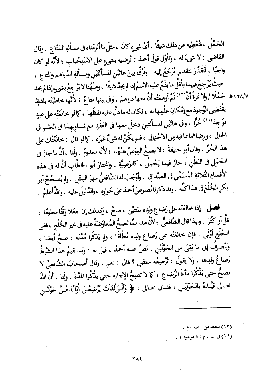 فصل: إذا خالعَتْه على رَضاعِ ولدِه سَنتيْنِ، صحَّ، وكذلك إن جعَلا وَقْتًا معلومًا، قلَّ أو كَثُرَ. وبهذا قال الشَّافعىُّ؛ لأنَّ هذا ممَّا تَصحُّ المُعاوَضَةُ عليه فى غير الخُلْعِ، ففى الخُلْعِ أوْلَى. فإن خالعَتْه على رَضاعِ ولدِه مُطْلقًا، ولم يَذكُرا مُدَّتَه، صحَّ أيضًا، ويَنْصرفُ إلى ما بَقِىَ من الحَوْلَيْنِ. نَصَّ عليه أحمدُ، قيل له: ويَستقيمُ هذا الشَّرطُ رَضاعُ ولدِها، ولا يقولُ: ترضِعُه سنتَينِ؟ قال: نعم. وقال أصحابُ الشَّافعىِّ لا يصحُّ حتى يَذْكُرَا مدَّةَ الرَّضاعِ، كما لا تصِحُّ الإجارة حتى يذْكُرا المدَّةَ. ولَنا، أَنَّ اللَّه تعالى قيَّدَهُ بالحَوْليْنِ، فقال تعالى: {وَالْوَالِدَاتُ يُرْضِعْنَ أَوْلَادَهُنَّ حَوْلَيْنِ