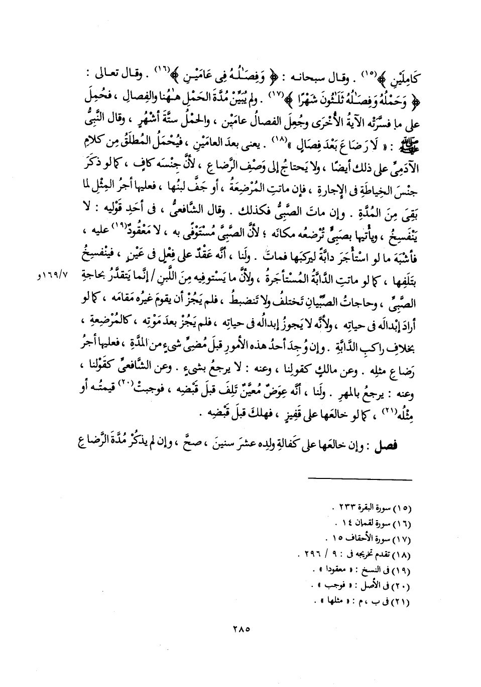كَامِلَيْنِ} (١٥). وقال سبحانه: {وَفِصَالُهُ فِى عَامَيْنِ} (١٦). وقال تعالى: {وَفِصَالُهُ ثَلَاثُونَ شَهْرًا} (١٧). ولم يُبَيِّنْ مُدَّةَ الحَمْلِ ههُنا والفِصالِ، فحُمِلَ على ما فسَّرَتْه الآيةُ الأُخْرَى وجُعِلَ الفصالُ عامَيْن، والحمْلُ ستَّةَ أشْهُرٍ، وقال النَّبِىُّ -صلى اللَّه عليه وسلم-: "لَا رَضَاعَ بَعْدَ فِصَالٍ" (١٨). يعنى بعدَ العامَيْنِ، فيُحْمَلُ المُطلَقُ مِن كلامِ الآدَمِىِّ على ذلك أيضًا، ولا يَحتاجُ إلى وَصْفِ الرَّضاعَ؛ لأنَّ جِنْسَه كافٍ، كما لو ذكَرَ جنْسَ الخِياطَةِ فى الإِجارةِ، فإن ماتتِ المُرْضِعَةُ، أو جَفَّ لبنُها، فعليها أجرُ المِثْلِ لما بَقِىَ مِنَ المُدَّةِ. وإن ماتَ الصَّبِىُّ فكذلك. وقال الشَّافعىُّ، فى أحَدِ قَوْليه: لا يَنْفَسِخُ، وأْتيها بصَبِىٍّ تُرْضعُه مكانَه؛ لأنَّ الصَّبِىَّ مُسْتَوْفًى به، لا مَعْقُودٌ (١٩) عليه، فأشْبَهَ ما لو اسْتأْجَرَ دابَّةً ليركبَها فماتَ. ولَنا، أنَّه عَقْدٌ على فِعْلٍ فى عَيْنٍ، فينْفسِخُ بتَلَفِها، كما لو ماتتِ الدَّابَّةُ المُسْتأجَرةُ، ولأنَّ ما يَسْتوفِيه مِنَ اللبنِ إنَّما يَتقدَّرُ بحاجةِ الصَّبِىِّ، وحاجاتُ الصِّبْيانِ تَختلفُ ولا تَنضبطُ، فلم يَجُزْ أن يقومَ غيرُه مَقامَه، كما لو أرادَ إبْدالَه فى حياتِه، ولأنَّه لا يَجوزُ إبدالُه فى حياتِه، فلم يَجُزْ بعدَ مَوْتِه، كالمُرْضِعةِ، بخلافِ راكبِ الدَّابَّةِ. وإن وُجِدَ أحدُ هذه الأمورِ قبلَ مُضِىِّ شىءٍ من المدَّةِ، فعليها أجرُ رَضاعِ مثلِه. وعن مالكٍ كقولِنا، وعنه: لا يرجعُ بشىءٍ. وعن الشَّافعىِّ كقَوْلنا، وعنه: يرجعُ بالمهرِ. ولَنا، أنَّه عِوَضٌ مُعيَّنٌ تَلِفَ قبلَ قَبْضِه، فوجبتْ (٢٠) قيمتُه أو مِثْلُه (٢١)، كما لو خالعَها على قَفِيزٍ، فهلكَ قبلَ قَبْضِه.