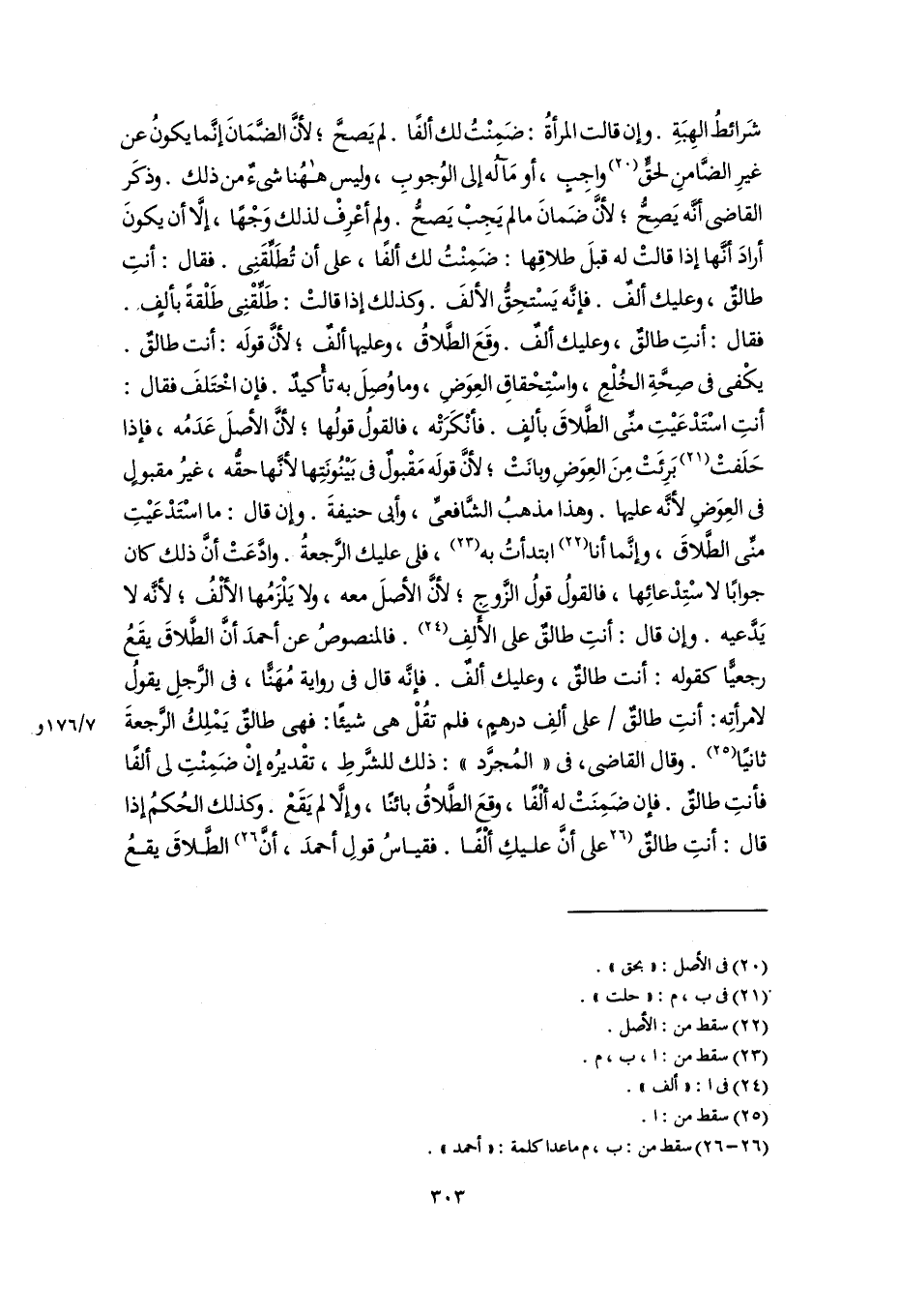 شَرائطُ الهِبَةِ. وإن قالت المرأةُ: ضَمِنْتُ لك ألفًا. لم يَصحَّ؛ لأنَّ الضَّمَانَ إنَّما يكونُ عن غيرِ الضَّامنِ لحقٍّ (٢٠) واجِبٍ، أو مَا له إلى الوُجوبِ، وليس ههُنا شىءٌ من ذلك. وذكَر القاضى أنَّه يَصِحُّ؛ لأنَّ ضَمانَ ما لم يَجِبْ يَصحُّ. ولم أعْرِفْ لذلك وَجْهًا، إلَّا أن يكونَ أرادَ أنَّها إذا قالتْ له قبلَ طلاقِها: ضَمِنْتُ لك ألفًا، على أن تُطَلِّقَنِى. فقال: أنتِ طالقٌ، وعليك ألفٌ. فإنَّه يَسْتحِقُّ الألفَ. وكذلك إذا قالتْ: طَلِّقْنِى طَلْقةً بألفٍ. فقال: أنتِ طالقٌ، وعليك ألفٌ. وقَعَ الطَّلاقُ، وعليها ألفٌ؛ لأنَّ قولَه: أنت طالقٌ. يكْفى فى صِحَّةِ الخُلْعِ، واسْتِحْقاقِ العِوَض، وما وُصِلَ به تأكيدٌ. فإن اخْتَلفَ فقال: أنتِ اسْتَدْعَيْتِ منِّى الطَّلاقَ بألفٍ. فأنْكَرَتْه، فالقولُ قولُها؛ لأنَّ الأصلَ عَدَمُه، فإذا حَلَفتْ (٢١) بَرِئَتْ مِنَ العِوَضِ وبانَتْ؛ لأنَّ قولَه مَقْبولٌ فى بَيْنُونَتِها لأنَّها حقُّه، غيرُ مقبولٍ فى العِوَض لأنَّه عليها. وهذا مذهبُ الشَّافعىِّ، وأبى حنيفةَ. وإن قال: ما اسْتَدْعَيْتِ منِّى الطَّلاقَ، وإنَّما أنا (٢٢) ابتدأتُ به (٢٣)، فلى عليك الرَّجعةُ. وادَّعَتْ أنَّ ذلك كان جوابًا لاسْتِدْعائِها، فالقولُ قولُ الزَّوجِ؛ لأنَّ الأصلَ معه، ولا يَلْزَمُها الألفُ؛ لأنَّه لا يَدَّعيه. وإن قال: أنتِ طالقٌ على الألفِ (٢٤). فالمنصوصُ عن أحمدَ أَنَّ الطَّلاقَ يقَعُ رجعيًّا كقوله: أنت طالقٌ، وعليك ألفٌ. فإنَّه قال فى رواية مُهَنًّا، فى الرجلِ يقولُ لامرأتِه: أنتِ طالقٌ على ألفِ درهمٍ، فلم تقُلْ هى شيئًا: فهى طالقٌ يَمْلِكُ الرَّجعةَ ثانيًا (٢٥). وقال القاضى، فى "المُجرَّد": ذلك للشَّرطِ، تقْديرُه إنْ ضَمِنْتِ لى ألفًا فأنتِ طالقٌ. فإن ضَمِنَتْ له ألْفًا، وقعَ الطَّلاقُ بائنًا، وإلَّا لم يَقَعْ. وكذلك الحُكمُ إذا قال: أنتِ طالقٌ [على أَنَّ عليكِ ألْفًا. فقياسُ قولِ أحمدَ، أنَّ] (٢٦) الطَّلاقَ يقعُ