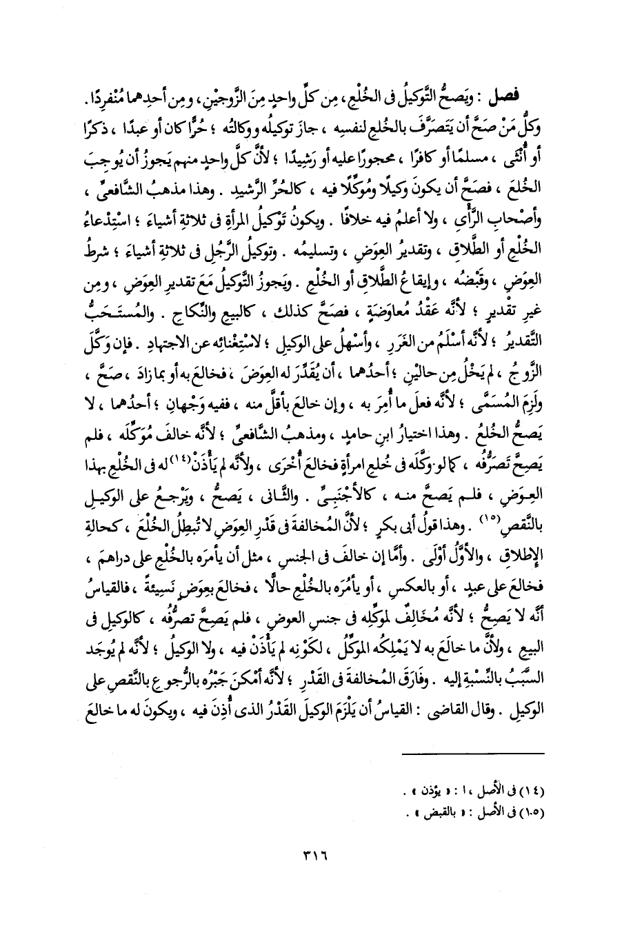 فصل: ويَصحُّ التَّوكيلُ فى الخُلْعِ، مِن كلِّ واحدٍ مِنَ الزَّوجيْنِ، ومِن أحدِهما مُنْفرِدًا. وكلُّ مَنْ صَحَّ أن يَتَصَرَّفَ بالخُلعِ لنفسِه، جازَ توكيلُه ووكالتُه؛ حُرًّا كان أو عبدًا، ذكرًا أو أُنثى، مسلمًا أو كافرًا، محجورًا عليه أو رَشِيدًا؛ لأنَّ كلَّ واحدٍ منهم يَجوزُ أن يُوجبَ الخُلعَ، فصَحَّ أن يكونَ وكيلًا ومُوكلًا فيه، كالحُرِّ الرَّشيدِ. وهذا مذهبُ الشَّافعىِّ، وأصْحابِ الرأى، ولا أعلمُ فيه خلافًا. ويكونُ تَوْكيلُ المرأةِ فى ثلاثةِ أشياءَ، اسْتِدْعاءُ الخُلْعِ أو الطَّلاقِ، وتقديرُ العِوَضِ، وتسليمُه. وتوكيلُ الرَّجُلِ فى ثلاثةِ أشياءَ؛ شرطُ العِوَضِ، وقَبْضُه، وإيقاعُ الطَّلاقِ أو الخُلْعِ. ويَجوزُ التَّوكيلُ مَعَ تقديرِ العِوَضِ، ومِن غيرِ تقْديرٍ؛ لأنَّه عَقْدُ مُعاوَضَةٍ، فصَحَّ كذلك، كالبيعِ والنِّكاحِ. والمُستَحَبُّ التَّقديرُ؛ لأنَّه أسْلَمُ من الغَرَرِ، وأسْهلُ على الوكيلِ؛ لاسْتِغْنائِه عن الاجتهادِ. فإن وَكَّلَ الزَّوجُ، لم يَخْلُ مِن حاليْنِ، أحدُهما، أن يُقَدِّرَ له العِوَضَ، فخالعَ به أو بما زادَ، صَحَّ، ولَزِمَ المُسَمَّى؛ لأنَّه فعلَ ما أُمِرَ به، وإن خالعَ بأقل منه، ففيه وَجْهانِ، أحدُهما، لا يَصحُّ الخُلعُ. وهذا اختيارُ ابنِ حامدٍ، ومذهبُ الشَّافعىِّ؛ لأنَّه خالفَ مُوَكِّلَه، فلم يَصِحَّ تَصَرُّفُه، كما لو وكَّلَه فى خُلعِ امرأةٍ فخالعَ أُخْرَى، ولأنه لم يَأْذَنْ (١٤) له فى الخُلْعِ بهذا العِوَضِ، فلم يَصحَّ منه، كالأجْنَبِىِّ. والثانى، يَصحُّ، ويَرْجعُ على الوكيلِ بالنَّقصِ (١٥). وهذا قولُ أبى بكرٍ؛ لأنَّ المُخالفةَ فى قَدْرِ العِوَضِ لا تُبطِلُ الخُلْعَ، كحالةِ الإِطلاقِ، والأوَّلُ أوْلَى. وأمَّا إن خالفَ فى الجنس، مثل أن يأمَره بالخُلْعِ على دراهمَ، فخالعَ على عبدٍ، أو بالعكسِ، أو يأمُرَه بالخُلْعِ حالًّا، فخالعَ بعِوَضٍ نَسِيئةً، فالقياسُ أنَّه لا يَصِحُّ؛ لأنَّه مُخَالِفٌ لموكلِه فى جنسِ العوض، فلم يَصِح تصرُّفه، كالوكيلِ فى البيعِ، ولأنَّ ما خالَعَ به لا يَمْلِكُه الموكِّلُ، لكَوْنِه لم يَأْذَنْ فيه، ولا الوكيلُ؛ لأنَّه لم يُوجَد السَّبَبَ بالنِّسْبةِ إليه. وفَارَقَ المُخالفةَ فى القَدْرِ؛ لأنَّه أمْكنَ جَبْرُه بالرُّجوعِ بالنَّقصِ على الوكيلِ. وقال القاضى: القياسُ أن يَلْزَمَ الوكيلَ القَدْرُ الذى أُذِنَ فيه، ويكونَ له ما خالعَ