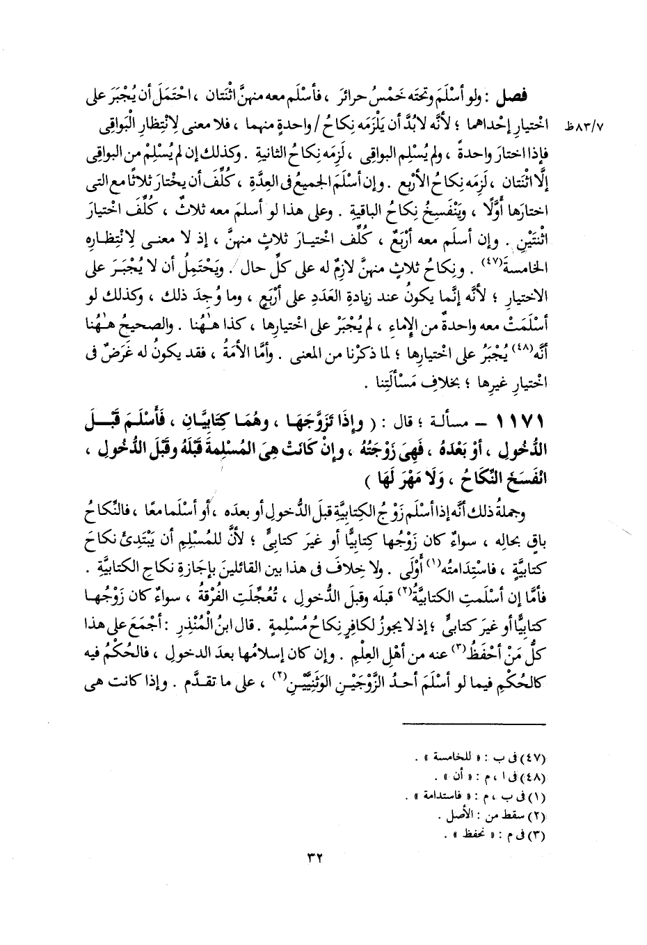 فصل: ولو أسْلَمَ وتحتَه خَمْسُ حرائرَ، فأسْلَم معه منهنَّ اثْنَتان، احْتَمَلَ أَنَّ يُجْبَرَ على اخْتيارِ إحْداهما؛ لأنَّه لابُدَّ أَنَّ يَلْزَمَه نِكاحُ واحدةٍ منهما، فلا معنى لِانْتِظارِ الْبَواقِى فإذا اختارَ واحدةً، ولم يُسْلِم البواقِى، لَزِمَه نِكاحُ الثانيةِ. وكذلك إن لم يُسْلِمْ من البواقِى إلَّا اثْنَتان، لَزِمَه نِكاحُ الأرْبع. وإن أسْلَمَ الجميعُ فى العِدَّةِ، كُلِّفَ أَنَّ يخْتارَ ثلاثًا مع التى اختارَها أوَّلًا، ويَنْفَسِخُ نِكاحُ الباقيةِ. وعلى هذا لو أسلمَ معه ثلاثٌ، كُلِّفَ اخْتيارَ اثْنتَيْنِ. وإن أسلَم معه أرْبَعٌ، كُلِّف اخْتيارَ ثلاثٍ منهنَّ، إذ لا معنى لِانْتِظارِه الخامسةَ (٤٧). ونِكاحُ ثلاثٍ منهنَّ لازِمٌ له على كل حال. ويَحْتَمِلُ أَنَّ لا يُجْبَرَ على الاختيارِ؛ لأنَّه إنَّما يكونُ عند زيادةِ العَدَدِ على أرْبَعٍ، وما وُجدَ ذلك، وكذلك لو أسْلَمَتْ معه واحدةٌ من الإِماءِ، لم يُجْبَرْ على اخْتيارِها، كذا هَهُنا. والصحيحُ ههُنا أنَّه (٤٨) يُجْبَرُ على اخْتيارِها؛ لما ذكرْنا من المعنى. وأمَّا الأمَةُ، فقد يكونُ له غَرَضٌ فى اخْتيارِ غيرِها؛ بخلافِ مَسْألَتِنا.