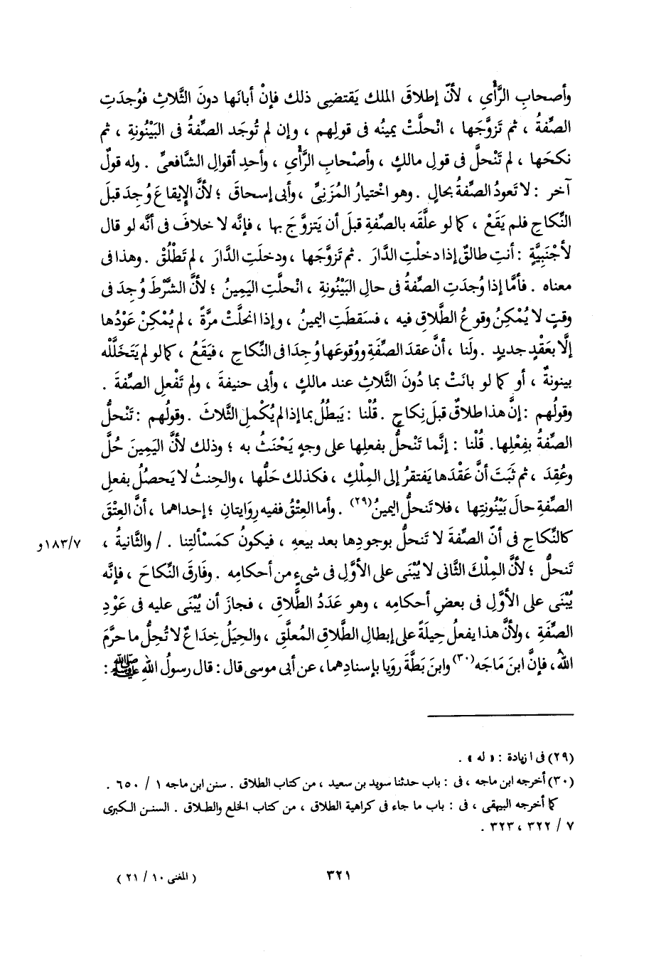 وأصحابِ الرَّأْىِ؛ لأنَّ إطلاقَ الملك يَقتضِى ذلك فإنْ أبانَها دونَ الثَّلاثِ فوُجدَتِ الصِّفةُ، ثم تَزوَّجَها، انحلَّتْ يمينُه فى قولِهم، وإن لم تُوجَد الصِّفةُ فى البَيْنُونةِ، ثم نكحَها، لم تَنْحلَّ فى قولِ مالكٍ، وأصْحابِ الرأى، وأحدِ أقوالِ الشَّافعىِّ. وله قولٌ آخر: لا تَعودُ الصِّفةُ بحالٍ. وهو اخْتيارُ المُزَنِىِّ، وأبى إسحاقَ؛ لأنَّ الإيقاعَ وُجِدَ قبلَ النِّكاحِ فلم يَقَعْ، كما لو علَّقَه بالصِّفةِ قبلَ أن يَتزوَّجَ بها، فإنَّه لا خلافَ فى أنَّه لو قال لأجْنَبِيَّةٍ: أنتِ طالقٌ إذا دخلْتِ الدَّارَ. ثم تَزوَّجَها، ودخلَتِ الدَّارَ، لم تَطْلُقْ. وهذا فى معناه. فأمَّا إذا وُجدَتِ الصِّفةُ فى حالِ البَيْنُونةِ، انْحلَّتِ اليَمِينُ؛ لأنَّ الشَّرْطَ وُجِدَ فى وقتٍ لا يُمْكِنُ وقوعُ الطَّلاقِ فيه، فسَقطَتِ اليمينُ، وإذا انحلَّتْ مرَّةً، لم يُمْكِنْ عَوْدُها إلَّا بعَقْدٍ جديدٍ. ولَنا، أَنَّ عقدَ الصِّفَةِ ووُقوعَها وُجِدَا فى النِّكاحِ، فيَقَعُ، كما لو لم يَتَخَلَّلْه بينونةٌ، أو كما لو بانَتْ بما دُونَ الثَّلاثِ عند مالكٍ، وأبى حنيفةَ، ولم تَفْعلِ الصِّفةَ. وقولُهم: إنَّ هذا طلاقٌ قبلَ نِكاحٍ. قُلْنا: يَبطُلُ بما إذا لم يُكْملِ الثَّلاثَ. وقولُهم: تَنْحلُّ الصِّفةُ بفِعْلِها. قُلْنا: إنَّما تَنْحلُّ بفعلِها على وجهٍ يَحْنَثُ به؛ وذلك لأنَّ اليَمِينَ حُلَّ وعُقِدَ، ثم ثَبَتَ أنَّ عَقْدَها يَفتقرُ إلى المِلْكِ، فكذلك حَلُّها، والحِنثُ لا يَحصُلُ بفعلِ الصِّفةِ حالَ بَيْنُونتِها، فلا تَنحلُّ اليمينُ (٢٩). وأما العِتْقُ ففيه رِوَايتانِ؛ إحداهما، أنَّ العِتْقَ كالنِّكاحِ فى أنَّ الصِّفةَ لا تَنحلُّ بوجودِها بعد بيعهِ، فيكونُ كمَسْألتِنا. والثَّانيةُ، تَنحلُّ؛ لأنَّ المِلْكَ الثَّانى لا يُبْنَى على الأوَّلِ فى شىءٍ من أحكامِه. وفَارقَ النِّكاحَ، فإنَّه يُبْنَى على الأوَّلِ فى بعض أحكامِه، وهو عَدَدُ الطَّلاقِ، فجازَ أن يُبْنَى عليه فى عَوْدِ الصِّفَةِ، ولأنَّ هذا يفعلُ حِيلَةً على إبطالِ الطَّلاقِ المُعلَّقِ، والحِيَلُ خِدَاعٌ لا تُحِلُّ ما حرَّمَ اللَّهُ، فإنَّ ابنَ مَاجَه (٣٠) وابنَ بَطَّةَ روَيا بإسنادِهما، عن أبى موسى قال: قال رسولُ اللَّهِ -صلى اللَّه عليه وسلم-: