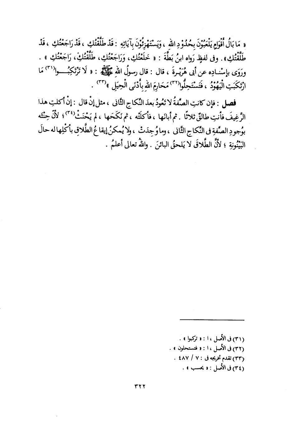 "مَا بَالُ أَقْوَامٍ يَلْعَبُوْنَ بِحُدُوْدِ اللَّهِ، وَيَسْتَهْزِئُوْنَ بِآيَاتِهِ: قَدْ طَلَّقْتُكِ، قَدْ رَاجَعْتُكِ، قَدْ طَلَّقْتُكِ". وفى لفظٍ رَواه ابنُ بَطَّةَ: "خَلَعْتُكِ، وَرَاجَعْتُكِ، طَلَّقْتُك، رَاجَعْتُكِ". ورَوَى بإسْنادِه عن أبى هُرَيْرةَ، قال: قال رسولُ اللَّهِ -صلى اللَّه عليه وسلم-: "لَا تَرْتَكِبُوا (٣١) مَا ارْتَكَبَتِ الْيَهُوْدُ، فَتَسْتَحِلُّوا (٣٢) مَحَارِمَ اللَّهِ بِأَدْنَى الْحِيَلِ" (٣٣).
