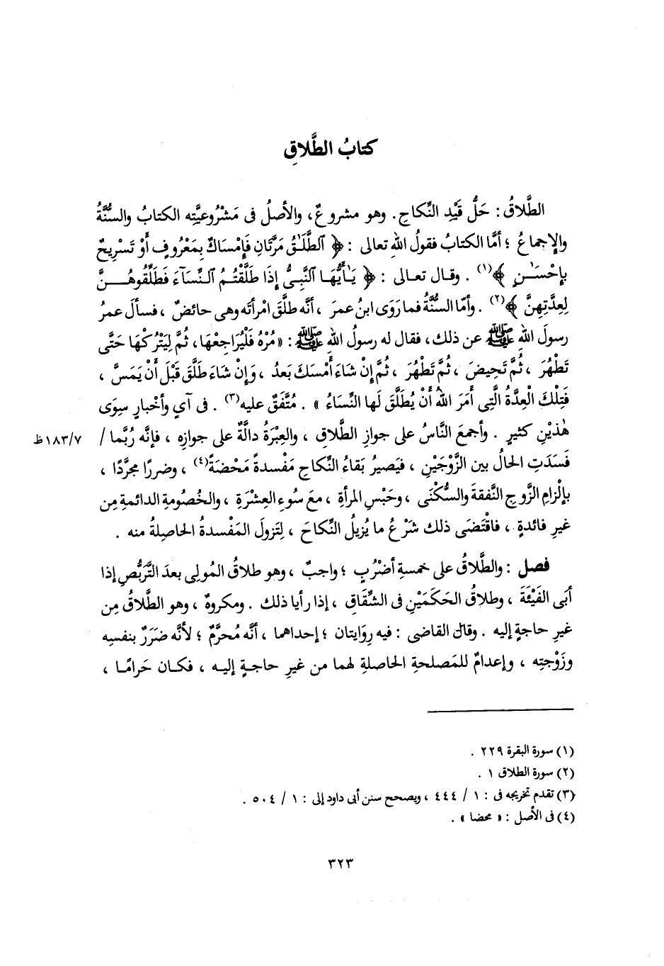 الطَّلاقُ: حَلُّ قَيْدِ النِّكاحِ. وهو مشروعٌ، والأصلُ فى مَشرُوعيَّتِه الكتابُ والسُّنَّةُ والإِجماعُ؛ أمَّا الكتابُ فقولُ اللَّه تعالى: {الطَّلَاقُ مَرَّتَانِ فَإِمْسَاكٌ بِمَعْرُوفٍ أَوْ تَسْرِيحٌ بِإِحْسَانٍ} (١). وقال تعالى: {يَاأَيُّهَا النَّبِىُّ إِذَا طَلَّقْتُمُ النِّسَاءَ فَطَلِّقُوهُنَّ لِعِدَّتِهِنَّ} (٢). وأمّا السُّنَّةُ فما رَوَى ابنُ عمرَ، أنَّه طلَّقَ امْرأتَه وهى حائضٌ، فسألَ عمرُ رسولَ اللَّهِ -صلى اللَّه عليه وسلم- عن ذلك، فقال له رسولُ اللَّه -صلى اللَّه عليه وسلم-: "مُرْهُ فَلْيُرَاجِعْهَا، ثُم لِيَتْرُكْهَا حَتَّى تَطْهُرَ، ثُم تَحِيضَ، ثُمَّ تَطْهُرَ، ثُمَّ إنْ شَاءَ أمْسَكَ بَعدُ، وإِنْ شَاءَ طَلَّقَ قَبْلَ أَنْ يَمَسَّ، فَتِلْكَ الْعِدَّةُ الَّتِى أمَرَ اللَّه أَنْ يُطَلقَ لَها النِّسَاءُ". مُتَّفَقٌ عليه (٣). فى آىٍ وأخْبارٍ سِوَى هذيْنِ كثيرٍ. وأجمعَ النَّاسُ على جوازِ الطَّلاقِ، والعِبْرَةُ دالَّة على جوازِه، فإنَّه رُبَّما فَسَدَتِ الحالُ بين الزَّوْجَيْنِ، فيَصيرُ بَقاءُ النِّكاحِ مَفْسدةً مَحْضَةً (٤)، وضررًا مجرَّدًا، بإلْزامِ الزَّوجِ النَّفقةَ والسُّكْنَى، وحَبْس المرأةِ، معَ سُوءِ العِشْرَةِ، والخُصُومةِ الدائمةِ مِن غيرِ فائدةٍ. فاقْتَضَى ذلك شَرْعُ ما يُزيلُ النِّكاحَ، لِتَزولَ المَفْسدةُ الحاصِلةُ منه.