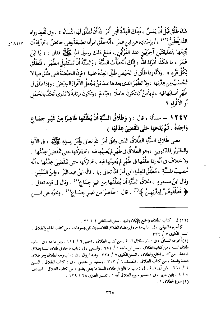 معنى طَلاقِ السُّنَّةِ الطَّلاقُ الذى وافَقَ أمرَ اللَّهِ تعالى وأمْرَ رسولهِ -صلى اللَّه عليه وسلم-، فى الآيةِ والخَبَريْنِ المذكورينِ، وهو الطَّلاقُ فى طُهْرٍ لم يُصِبْها فيه، ثم يَتركُها حتى تَنْقَضِىَ عِدَّتُها. ولا خلافَ فى أنَّه إذا طلقَها فى طُهْرٍ لم يُصِبْها فيه، ثم تركَها حتى تَنْقَضِىَ عِدَّتُها، أنَّه مُصيبٌ للسُّنَّةِ، مُطَلِّقٌ للعِدَّةِ التى أمرَ اللَّه تعالى بها. قالَه ابنُ عبدِ البَرِّ، وابنُ المُنْذِرِ. وقال ابنُ مسعودٍ: طلاقُ السُّنَّةِ أن يُطَلِّقَها مِن غيرِ جِمَاعٍ (١). وقال فى قوله تعالى: {فَطَلِّقُوهُنَّ لِعِدَّتِهِنَّ} (٢). قال: طَاهِرًا من غيرِ جِمَاعٍ (١). ونحوُه عن ابنِ