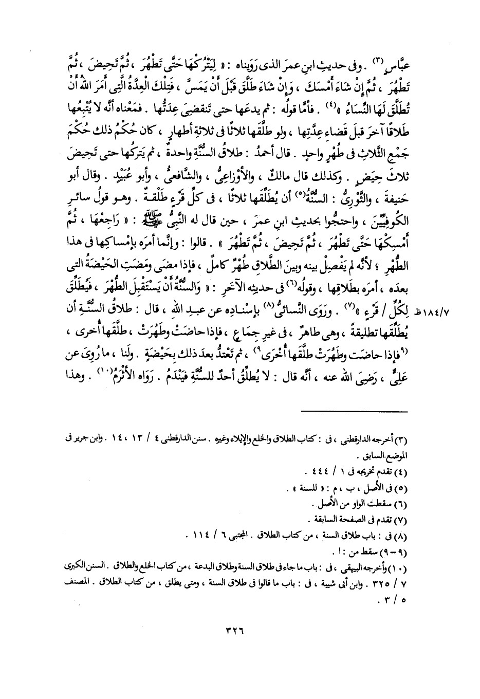 عبَّاسٍ (٣). وفى حديثِ ابنِ عمرَ الذى رَوَيناه: "لِيَتْرُكْهَا حَتَّى تَطْهُرَ، ثُمَّ تَحِيضَ، ثُمَّ تَطْهُرَ، ثُمَّ إِنْ شَاءَ أَمْسَكَ، وإِنْ شَاءَ طَلَّقَ قَبْلَ أَنْ يَمَسَّ، فَتِلْكَ الْعِدَّةُ الَّتِى أَمَرَ اللَّهُ أَنْ تُطَلَّقَ لَهَا النِّسَاءُ" (٤). فأمَّا قولُه: ثم يدعَها حتى تَنقضِىَ عِدَتُّها. فمَعْناه أنَّه لا يُتْبِعُها طَلاقًا آخرَ قبلَ قَضاءِ عِدَّتِها، ولو طلَّقَها ثلاثًا فى ثلاثةِ أطهارٍ، كان حُكْمُ ذلك حُكْمَ جَمْعِ الثَّلاثِ فى طُهْرٍ واحدٍ. قال أحمدُ: طلاقُ السُّنَّةِ واحدةٌ، ثم يَتركُها حتى تَحِيضَ ثلاثَ حِيَضٍ. وكذلك قال مالكٌ، والأوْزاعِىُّ، والشَّافعىُّ، وأبو عُبَيْدٍ. وقال أبو حَنيفةَ، والثَّوْرِىُّ: السُّنَّةُ (٥) أن يُطَلِّقَها ثلاثًا، فى كلِّ قَرْءٍ طَلْقةٌ. وهو قولُ سائرِ الكُوفِيِّيْنَ، واحتجُّوا بحديثِ ابنِ عمرَ، حين قال له النَّبِىُّ -صلى اللَّه عليه وسلم-: "رَاجِعْهَا، ثُمَّ أَمْسِكْهَا حَتَّى تَطْهُرَ، ثُمَّ تَحِيضَ، ثُمَّ تَطْهُرَ". قالوا: وإنَّما أمرَه بإمْساكِها فى هذا الطُّهْرِ؛ لأنَّه لم يَفْصِلْ بينه وبينَ الطَّلاقِ طُهْرٌ كاملٌ، فإذا مضَى ومَضَتِ الحَيْضَةُ التى بعدَه، أمرَه بطلاقِها، وقولُه (٦) فى حديثِه الآخَرِ: "وَالسُّنَّةُ أَنْ يَسْتَقْبِلَ الطُّهْرَ، فيطَلِّقَ لِكُلِّ قَرْءٍ" (٧). ورَوَى النَّسائىُّ (٨) بإسْنادِه عن عبدِ اللَّهِ، قال: طلاقُ السُّنَّةِ أن يُطَلِّقَها تطليقةً، وهى طاهرٌ، فى غيرِ جِمَاعٍ، فإذا حاضَتْ وطَهُرَتْ، طلَّقَها أُخرى، [فإذا حاضَت وطَهُرَتْ طلَّقَها أُخْرَى] (٩)، ثم تَعْتدُّ بعدَ ذلك بِحَيْضَةٍ. ولَنا، ما رُوِىَ عن عَلِىٍّ، رَضِىَ اللَّهُ عنه، أنَّه قال: لا يُطلِّقُ أحدٌ للسُّنَّةِ فيَنْدَمُ. رَوَاه الأثْرَمُ (١٠). وهذا