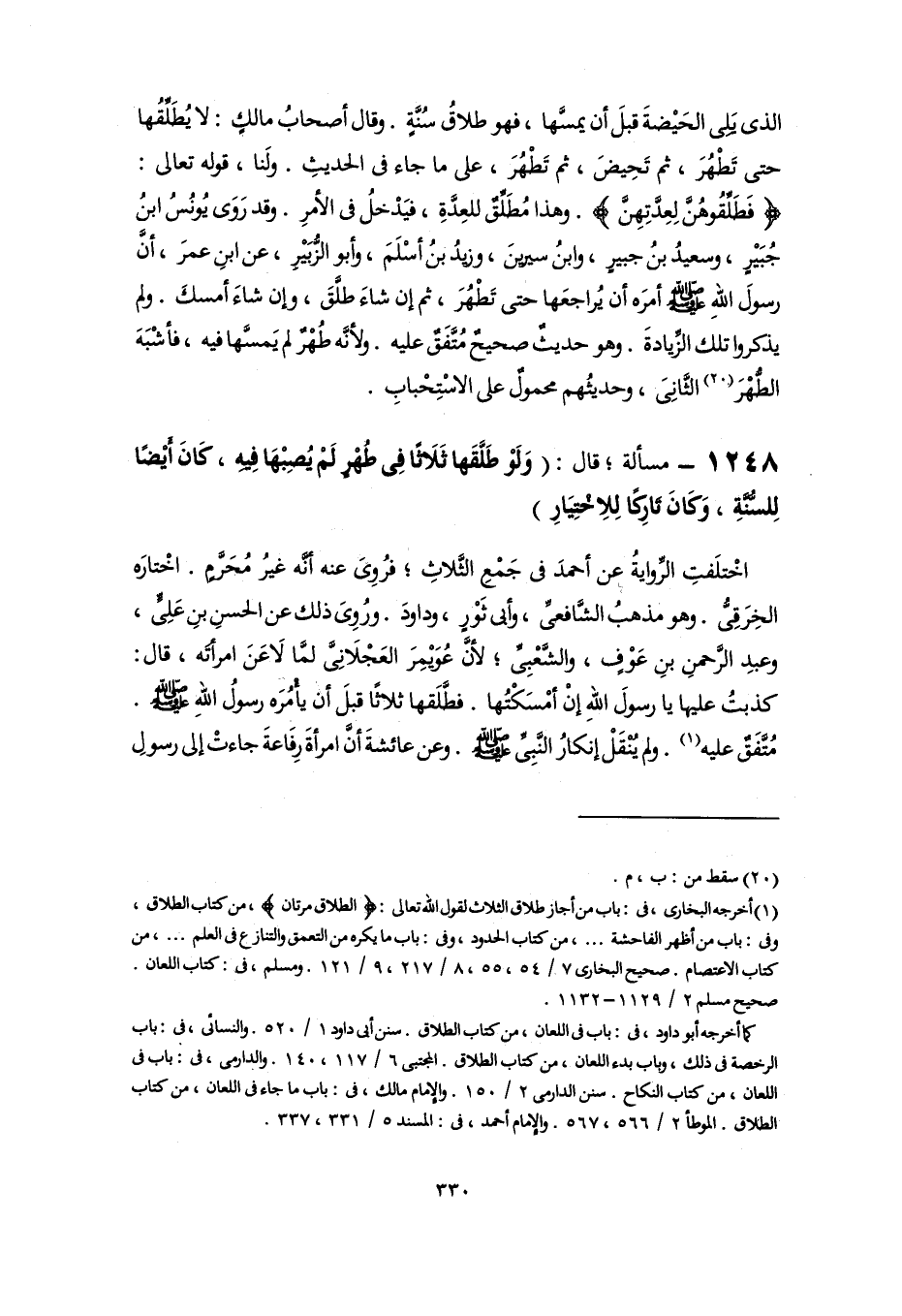 الذى يَلِى الحَيْضةَ قبلَ أن يمسَّها، فهو طلاقُ سُنَّةٍ. وقال أصحابُ مالكٍ: لا يُطَلِّقُها حتى تَطْهُرَ، ثم تَحِيضَ، ثم تَطْهُرَ، على ما جاء فى الحديثِ. ولَنا، قوله تعالى: {فَطَلِّقُوهُنَّ لِعِدَّتِهِنَّ}. وهذا مُطَلِّقٌ للعِدَّةِ، فيَدْخلُ فى الأمرِ. وقد رَوَى يُونُسُ بنُ جُبَيْرٍ، وسعيدُ بنُ جبيرٍ، وابنُ سيرينَ، وزيدُ بنُ أسْلَمَ، وأبو الزُّبَيْرِ، عن ابنِ عمرَ، أَنَّ رسولَ اللَّهِ -صلى اللَّه عليه وسلم- أمرَه أن يُراجعَها حتى تَطْهُرَ، ثم إن شاءَ طلَّقَ، وإن شاءَ أمسكَ. ولم يذكروا تلك الزِّيادةَ. وهو حديثٌ صحيحٌ مُتَّفَقٌ عليه. ولأنَّه طُهْرٌ لم يَمسَّها فيه، فأشْبَهَ الطُّهْرَ (٢٠) الثَّانِىَ، وحديثُهم محمولٌ على الاسْتِحْبابِ.