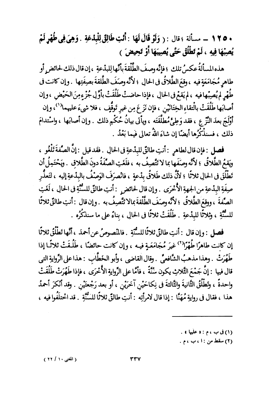 فصل: فإن قال لطاهرٍ: أنتِ طالقٌ للبِدْعةِ فى الحالِ. فقد قيل: إنَّ الصِّفةَ تَلْغُو، ويَقعُ الطَّلاقُ؛ لأنَّه وصَفَها بما لا تَتَّصِفُ به، فلَغَتِ الصِّفَةُ دونَ الطَّلاقِ. ويَحْتَمِلُ أن تَطْلُقَ فى الحالِ ثلاثًا؛ لأنَّ ذلك طَلاقُ بِدْعةٍ، فانْصرَفَ الوَصْفُ بالبدْعةِ إليه، لتَعذُّرِ صِفَةِ البِدْعةِ من الجهةِ الأُخْرَى. وإن قال لحائضٍ: أنتِ طالقٌ للسُّنَّةِ فى الحالِ، لَغَتِ الصِّفةَ، ووقعَ الطَّلاقُ؛ لأنَّه وصَفَ الطَّلْقةَ بما لا تَتَّصِفُ به. وإن قال: أنتِ طالقٌ ثلاثًا للسُّنَّةِ، وثلاثًا للبِدْعةِ. طَلُقَتْ ثلاثًا فى الحالِ، بِناءً على ما سنذكُرُه.