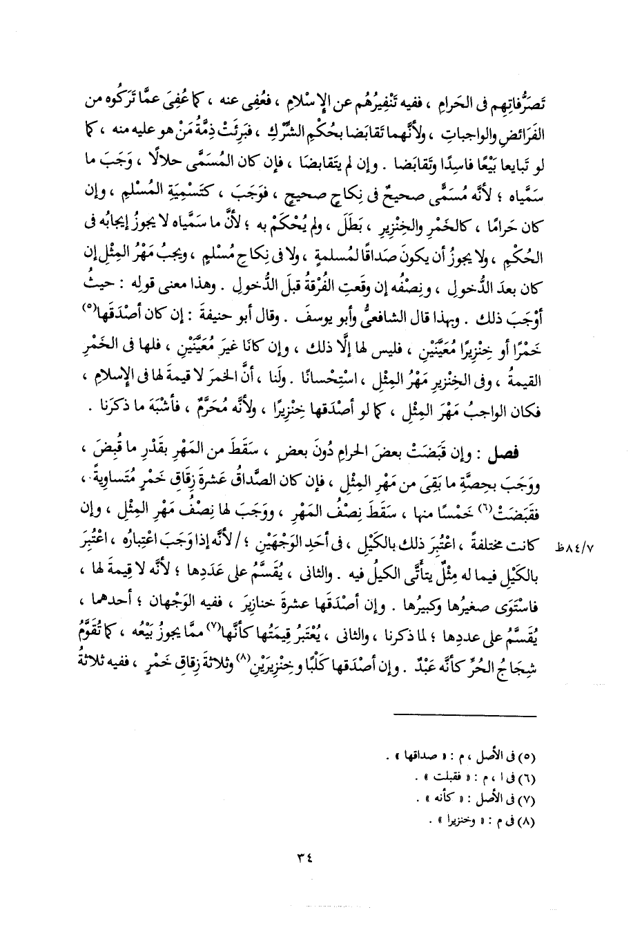 تَصَرُّفاتِهِم فى الحَرامِ، ففيه تَنْفِيرُهُم عن الإِسْلامِ، فعُفِى عنه، كما عُفِىَ عمَّا تَرَكُوه من الفَرَائض والواجباتِ، ولأنَّهما تَقابَضا بحُكْمِ الشِّرْكِ، فبَرِئَتْ ذِمَّةُ مَنْ هو عليه منه، كما لو تَبايعا بَيْعًا فاسِدًا وَتَقابَضا. وإن لم يتَقابضَا، فإن كان المُسَمَّى حلالًا، وَجَبَ ما سَمَّياه؛ لأنَّه مُسَمًّى، صحيحٌ فى نِكاحٍ صحيحٍ، فوَجَبَ، كتَسْمِيَةِ المُسْلمِ، وإن كان حَرامًا، كالخَمْرِ والخِنْزِيرِ، بَطَلَ، ولم يُحْكَمْ به؛ لأنَّ ما سَمَّياه لا يجوزُ إيجابُه فى الحُكْمِ، ولا يجوزُ أن يكونَ صَداقًا لمُسلمةٍ، ولا فى نِكاحِ مُسْلمٍ، ويجبُ مَهْرُ المِثْلِ إن كان بعدَ الدُّخولِ، ونِصْفُه إن وقَعتِ الفُرْقةُ قبلَ الدُّخولِ. وهذا معنى قولِه: حيثُ أوْجَبَ ذلك. وبهذا قال الشافعىُّ وأبو يوسفَ. وقال أبو حنيفةَ: إن كان أصْدَقَها (٥) خَمْرًا أو خِنْزِيرًا مُعَيَّنَيْنِ، فليس لها إلَّا ذلك، وإن كانَا غيرَ مُعَيَّنَيْنِ، فلها فى الخَمْرِ القيمةُ، وفى الخِنْزيرِ مَهْرُ المِثْلِ، اسْتِحْسانًا. ولَنا، أَنَّ الخمرَ لا قيمةَ لها فى الإِسلامِ، فكان الواجبُ مَهْرَ المِثْلِ، كما لو أصْدَقها خِنْزِيرًا، ولأنَّه مُحَرَّم، فأشْبَهَ ما ذكرَنا.