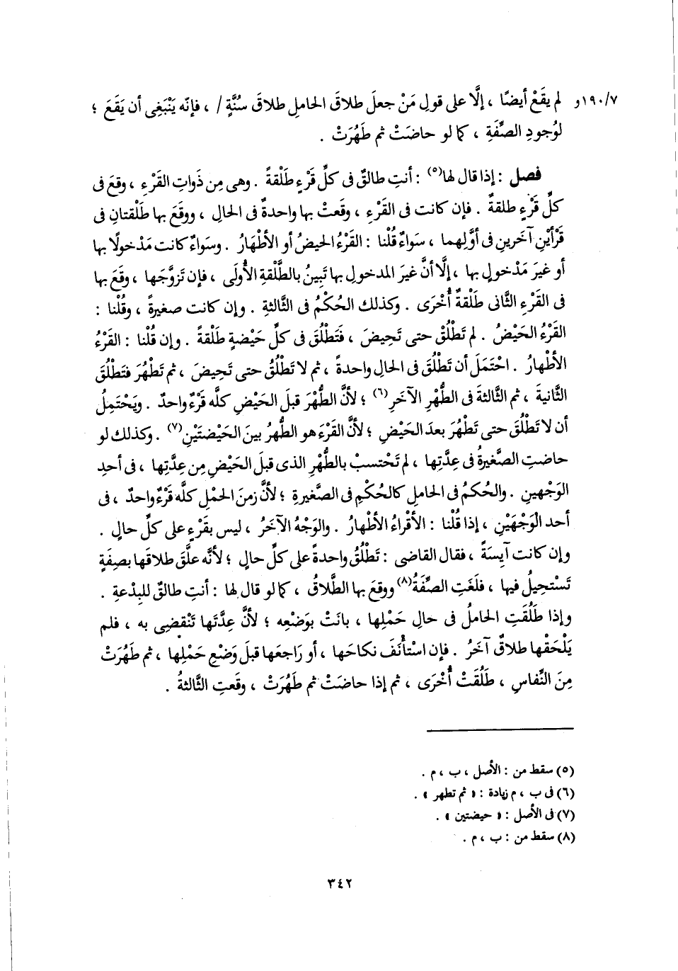 فصل: إذا قال لها (٥): أنتِ طالقٌ فى كلِّ قَرْءٍ طَلْقةً. وهى مِن ذَواتِ القَرْءِ، وقعَ فى كلِّ قَرْءٍ طلقةٌ. فإن كانت فى القَرْءِ، وقَعتْ بها واحدةٌ فى الحالِ، ووقَعَ بها طَلْقتانِ فى قَرْأيْنِ آخَرينِ فى أوَّلِهما، سَواءٌ قُلْنا: القَرْءُ الحيضُ أو الأطْهَارُ. وسَواءٌ كانت مَدْخولًا بها أو غيرَ مَدْخولٍ بها، إلا أَنَّ غيرَ المدخولِ بها تَبِينُ بالطَّلْقةِ الأُولَى، فإن تَزوَّجَها، وقَعَ بها فى القَرْءِ الثَّانى طَلْقةٌ أُخْرَى. وكذلك الحُكْمُ فى الثَّالثةِ. وإن كانت صغيرةً، وقُلْنا: القَرْءُ الحَيْضُ. لم تَطْلُقْ حتى تَحِيضَ، فَتَطْلُقَ فى كلِّ حَيْضةٍ طَلْقةً. وإن قُلْنا: القَرْءُ الأطْهارُ. احْتَمَلَ أن تَطْلُقَ فى الحالِ واحدةً، ثم لا تَطْلُقُ حتى تَحِيضَ، ثم تَطْهُرَ فتَطْلُقَ الثَّانيةَ، ثم الثَّالثةَ فى الطُّهْرِ الآخَرِ (٦)؛ لأنَّ الطُّهْرَ قبلَ الحَيْضِ كلَّه قَرْءٌ واحدٌ. ويَحْتَمِلُ أن لا تَطْلُقَ حتى تَطْهُرَ بعدَ الحَيْضِ؛ لأنَّ القَرْءَ هو الطُّهْرُ بينَ الحَيْضتَيْنِ (٧). وكذلك لو حاضتِ الصَّغيرةُ فى عِدَّتِها، لم تَحْتسبْ بالطُّهْرِ الذى قبلَ الحَيْض مِن عِدَّتِها، فى أحدِ الوَجْهينِ. والحُكمُ فى الحاملِ كالحُكْمِ فى الصَّغيرةِ؛ لأنَّ زمنَ الحمْلِ كلَّه قَرْءٌ واحدٌ، فى أحد الْوَجْهَيْنِ، إذا قُلْنا: الأقْراءُ الأطْهارُ. والوَجْهُ الآخَرُ، ليس بقَرْءٍ على كلِّ حالٍ. وإن كانت آيِسَةً، فقال القاضى: تَطْلُقُ واحدةً على كل حالٍ؛ لأنَّه علَّقَ طلاقَها بصِفَةٍ تَسْتحِيلُ فيها، فلَغَتِ الصِّفَةُ (٨) ووقعَ بها الطَّلاقُ، كما لو قال لها: أنتِ طالقٌ للبِدْعةِ. وإذا طَلُقَتِ الحاملُ فى حالِ حَمْلِها، بانَتْ بوَضْعِه؛ لأنَّ عِدَّتَها تَنْقضِى به، فلم يَلْحَقْها طلاقٌ آخَرُ. فإن اسْتأْنَفَ نكاحَها، أو رَاجعَها قبلَ وَضْعِ حَمْلِهْا، ثم طَهُرَتْ مِنَ النِّفاسِ، طَلُقَتْ أُخْرَى، ثم إذا حاضَتْ ثم طَهُرَتْ، وقَعتِ الثَّالثةُ.