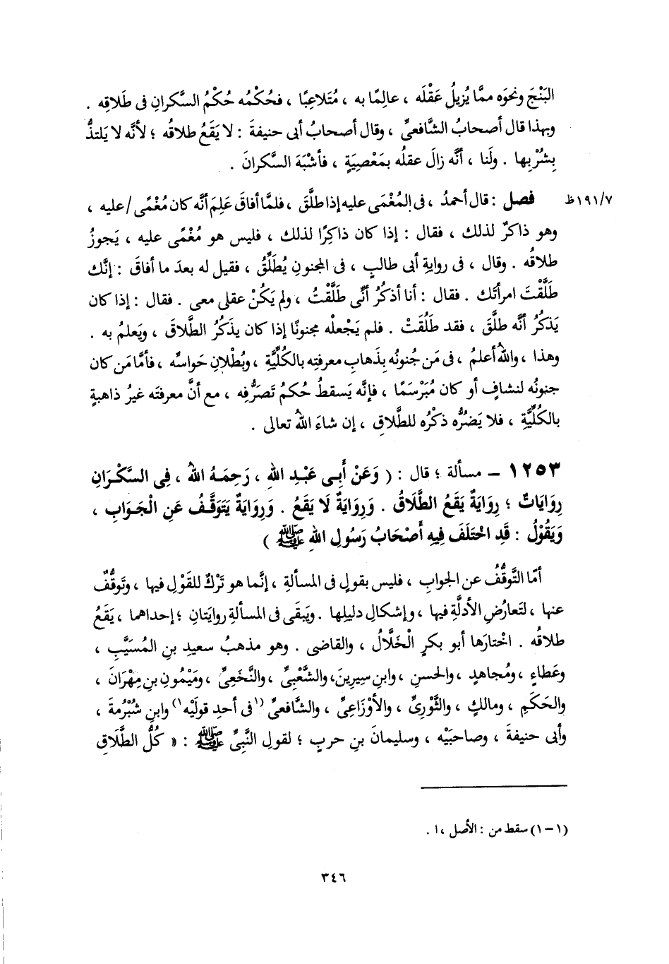 فصل: قال أحمدُ، فى المُغْمَى عليه إذا طلَّقَ، فلمَّا أفاقَ عَلِمَ أنَّه كان مُغْمًى عليه، وهو ذاكرٌ لذلك، فقال: إذا كان ذاكِرًا لذلك، فليس هو مُغْمًى عليه، يَجوزُ طلاقُه. وقال، فى روايةِ أبى طالبٍ، فى المجنونِ يُطَلِّقُ، فقيل له بعدَ ما أفاقَ: إنَّك طَلَّقْتَ امرأتُك. فقال: أنا أذكُرُ أنِّى طَلَّقْتُ، ولم يَكُنْ عقلى معى. فقال: إذا كان يَذكُرُ أنَّه طلَّقَ، فقد طَلُقَتْ. فلم يَجْعلْه مجنونًا إذا كان يذَكُرُ الطَّلاقَ، ويَعلمُ به. وهذا، واللَّهُ أعلمُ، فى مَن جُنونُه بِذَهابِ معرفتِه بالكُلِّيَّةِ، وبُطْلانِ حَواسِّه، فأمَّا مَن كان جنونُه لنشافٍ أو كان مُبَرْسَمًا، فإنَّه يَسقطُ حُكمُ تَصَرُّفِه، مع أَنَّ معرفتَه غيرُ ذاهبةٍ بالكُلِّيَّةِ، فلا يَضُرُّه ذكْرُه للطَّلاقِ، إن شاءَ اللَّه تعالى.
