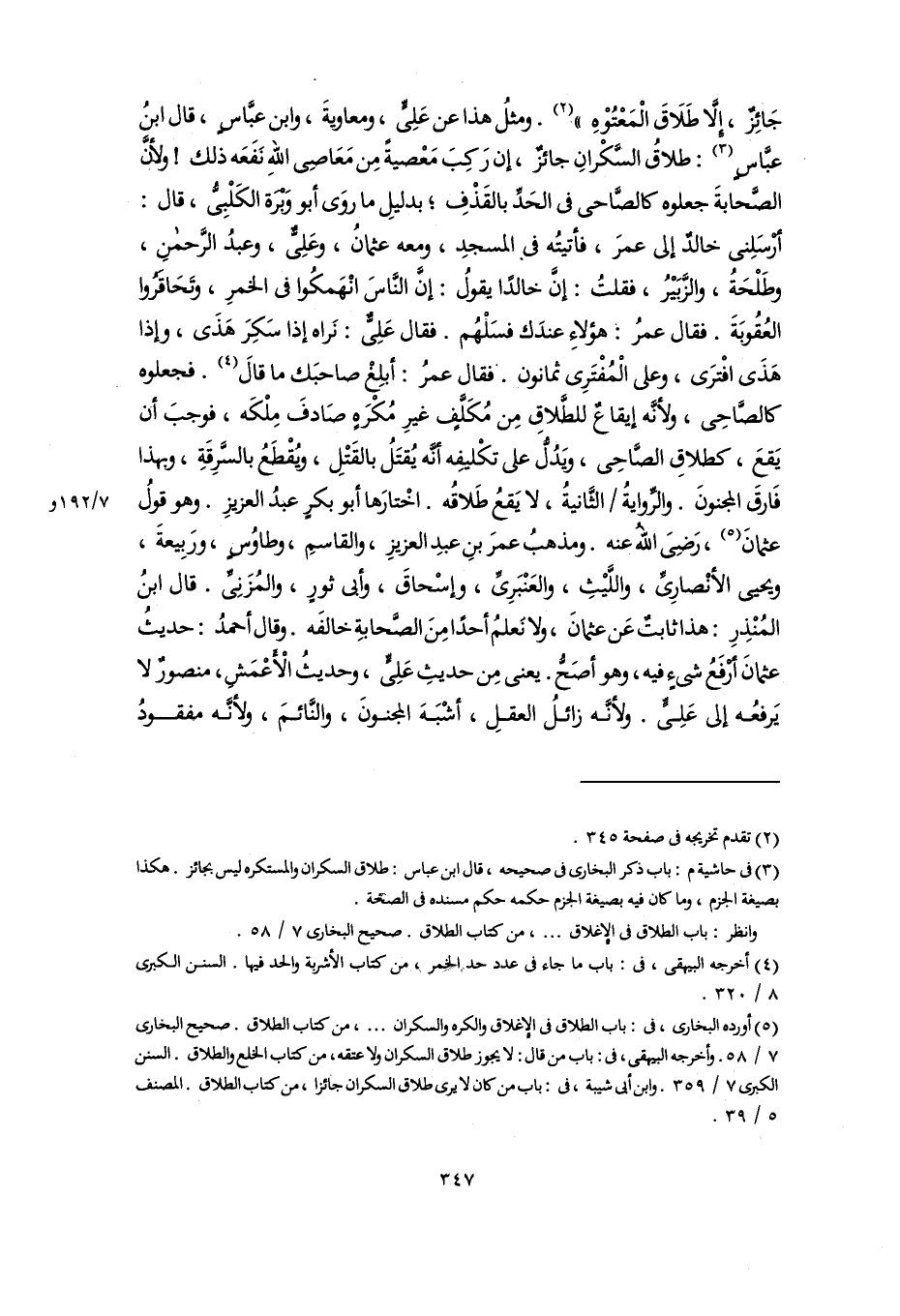 جَائِزٌ، إلَّا طَلَاقَ الْمَعْتُوْهِ" (٢). ومثلُ هذا عن عَلِىٍّ، ومعاويةَ، وابن عبَّاسٍ، قال ابنُ عبَّاسٍ (٣): طلاقُ السَّكْرانِ جائزٌ، إن رَكِبَ مَعْصيةً مِن مَعَاصِى اللَّهِ نَفَعَه ذلك! ولأنَّ الصَّحابةَ جعلوه كالصَّاحى فى الحَدِّ بالقَذْفِ؛ بدليلِ ما روَى أبو وَبْرَة الكَلْبِىُّ، قال: أرْسَلِنى خالدٌ إلى عمرَ، فأتيتُه فى المسجدِ، ومعه عثمانُ، وَعَلِىٌّ، وعبدُ الرَّحمنِ، وطَلْحَةُ، والزَّبَيْرُ، فقلتُ: إنَ خالدًا يقولُ: إنَّ النَّاسَ انْهَمكُوا فى الخمرِ، وتَحَاقَرُوا العُقُوَبةَ. فقال عمرُ: هؤلاءِ عندَك فسَلْهُم. فقال عَلِىٌّ: نَراه إذا سَكِرَ هَذَى، وإذا هَذَى افْترَى، وعلى الْمُفْتَرِى ثمانون. فقال عمرُ: أبلِغْ صاحبَك ما قالَ (٤). فجعلوه كالصَّاحِى، ولأنَّه إيقاعٌ للطَّلاقِ مِن مُكَلَّفٍ غيرِ مُكْرَهٍ صَادفَ مِلْكَه، فوجبَ أن يَقعَ، كطلاقِ الصَّاحِى، ويَدُلُّ على تكْليفِه أنَّه يُقتَلُ بالقَتْلِ، ويُقْطَعُ بالسَّرِقَةِ، وبهذا فَارقَ المجنونَ. والرِّوايةُ الثَّانيةُ، لا يَقعُ طَلاقُه. اخْتارَها أبو بكرٍ عبدُ العزيزِ. وهو قولُ عثمانَ (٥)، رَضِىَ اللَّهُ عنه. ومذهبُ عمرَ بنِ عبدِ العزيزِ، والقاسمِ، وطاوُسٍ، ورَبِيعةَ، ويحيى الأنْصارِىِّ، واللَّيْثِ، والعَنْبَرِىِّ، وإسْحاقَ، وأبى ثورٍ، والمُزَنِىِّ. قال ابنُ المُنْذِرِ: هذا ثابتٌ عَن عثمانَ، ولا نَعلمُ أحدًا مِنَ الصَّحابةِ خالفَه. وقال أحمدُ: حديثُ عثمانَ أرْفَعُ شىءٍ فيه، وهو أصَحُّ. يعنى مِن حديثِ عَلِىٍّ، وحديثُ الْأَعْمَشِ، منصورٌ لا يَرفعُه إلى عَلِىٍّ. ولأنَّه زائلُ العقلِ، أشْبَهَ المجنونَ، والنَّائمَ، ولأنَّه مفقودُ
