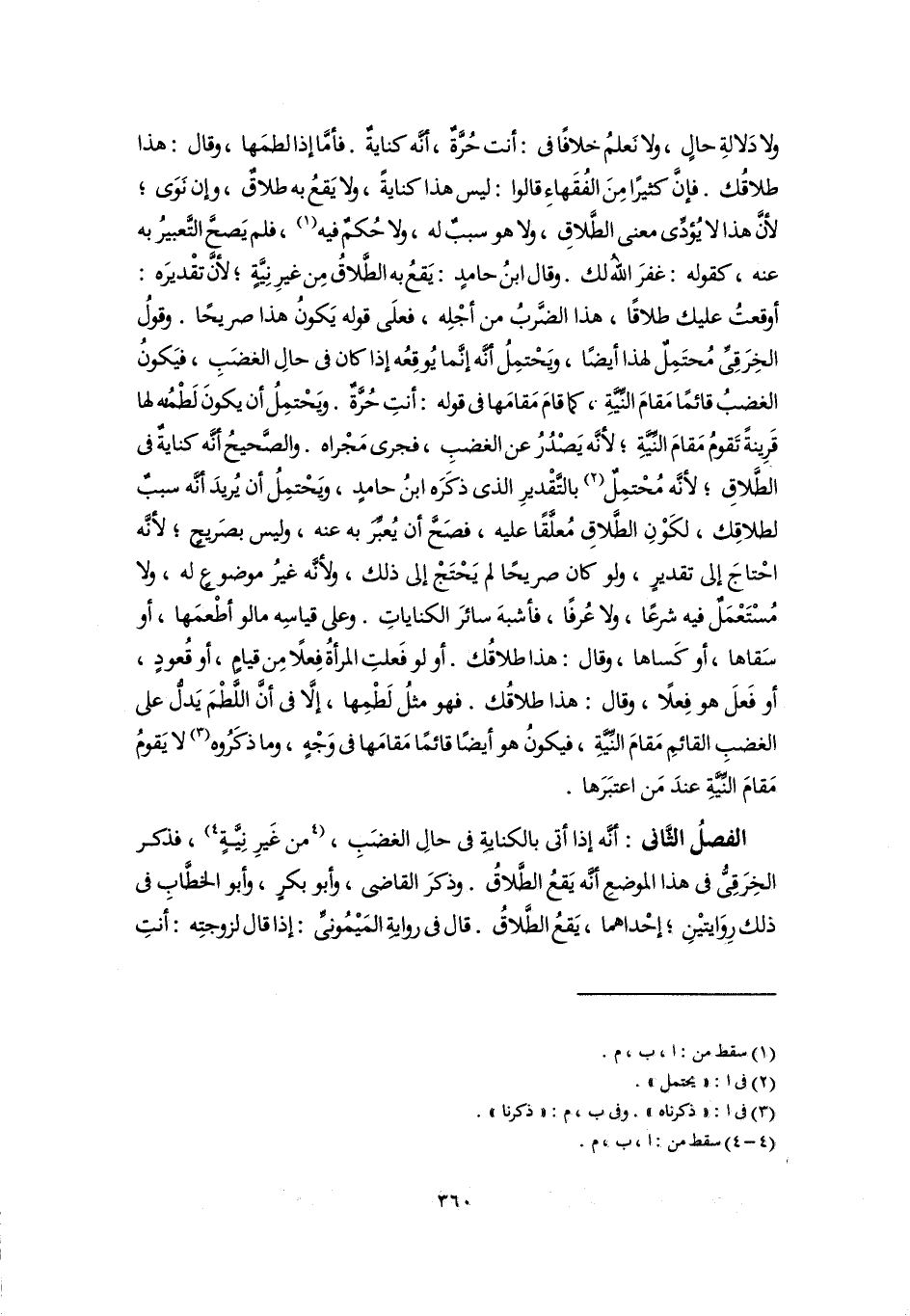 الفصلُ الثَّانى: أنَّه إذا أتى بالكنايةِ فى حالِ الغضَبِ، [من غَيرِ نِيَّةٍ] (٤)، فذكر الخِرَقِىُّ فى هذا الموضعِ أنَّه يَقعُ الطَّلاقُ. وذكرَ القاضى، وأبو بكرٍ، وأبو الخطَّابِ فى ذلك رِوَايتيْنِ؛ إحْداهما، يَقعُ الطَّلاقُ. قال فى روايةِ المَيْمُونىِّ: إذا قال لزوجتِه: أنتِ