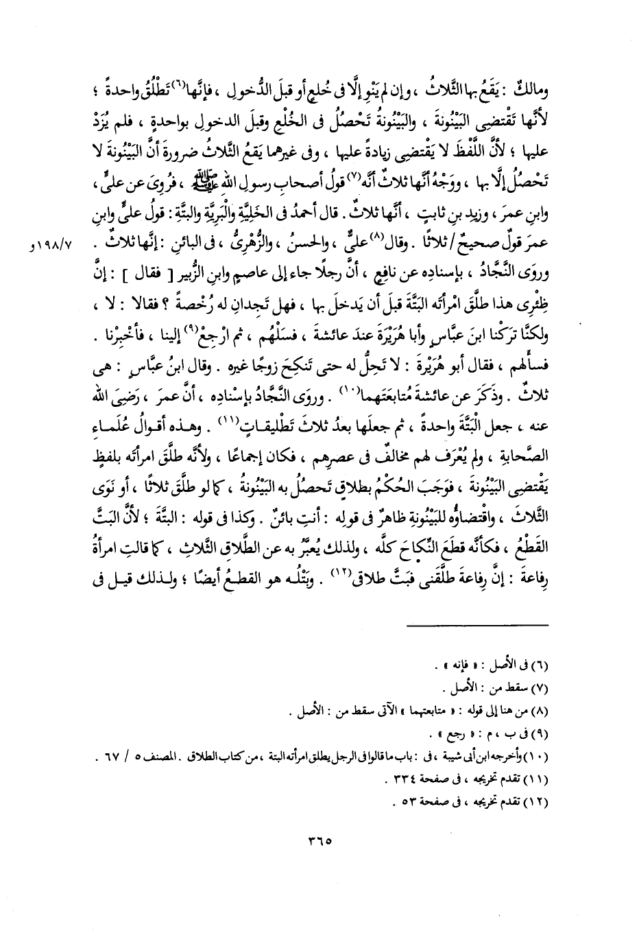 ومالكٌ: يَقَعُ بها الثَّلاثُ، وإن لم يَنْوِ إلَّا فى خُلعٍ أو قبلَ الدُّخولِ، فإنَّها (٦) تَطْلُقُ واحدةً؛ لأنَّها تَقْتضِى البَيْنُونةَ، والبَيْنُونةُ تَحْصُلُ فى الخُلْعِ وقبلَ الدخولِ بواحدةٍ، فلم يُزَدْ عليها؛ لأنَّ اللَّفْظَ لا يَقْتضِى زيادةً عليها، وفى غيرهما يَقعُ الثَّلاثُ ضرورةَ أَنَّ البَيْنُونةَ لا تَحْصُلُ إلَّا بها، ووَجْهُ أنَّها ثلاثٌ أنَّه (٧) قولُ أصحابِ رسولِ اللَّهِ -صلى اللَّه عليه وسلم-، فرُوِىَ عن علىٍّ، وابنِ عمرَ، وزيدِ بنِ ثابتٍ، أنَّها ثلاثٌ. قال أحمدُ فى الخَلِيَّةِ والْبَرِيَّةِ والبتَّةِ: قولُ علىٍّ وابنِ عمرَ قولٌ صحيحٌ ثلاثًا. وقال (٨) علىٌّ، والحسنُ، والزُّهْرِىُّ، فى البائنِ: إنَّها ثلاثٌ. وروَى النَّجَّادُ، بإسنادِه عن نافِعٍ، أَنَّ رجلًا جاء إلى عاصمٍ وابنِ الزُّبير [فقال]: إنَّ ظِئْرِى هذا طلَّقَ امْرأتَه البَتَّةَ قبلَ أن يَدخلَ بها، فهل تَجِدانِ له رُخْصةً؟ فقالا: لا، ولكنَّا ترَكْنا ابنَ عبَّاسٍ وأبا هُرَيْرَةَ عندَ عائشةَ، فسَلْهُم، ثم ارْجِعْ (٩) إلينا، فأخْبِرْنا. فسأَلهم، فقال أبو هُرَيْرةَ: لا تَحِلُّ له حتى تَنكِحَ زوجًا غيره. وقال ابنُ عبَّاسٍ: هى ثلاثٌ. وذَكَرَ عن عائشةَ مُتابعَتَهما (١٠). وروَى النَّجَّادُ بإسْنادِه، أَنَّ عمرَ، رَضِىَ اللَّه عنه، جعل الْبَتَّةَ واحدةً، ثم جعلَها بعدُ ثلاثَ تَطْليقاتٍ (١١). وهذه أقوالُ عُلَماءِ الصَّحابةِ، ولم يُعْرَف لهم مخالفٌ فى عصرِهم، فكان إجماعًا، ولأنَّه طلَّقَ امرأتَه بلفظٍ يَقْتضِى البَيْنُونةَ، فوَجَبَ الحُكْمُ بطلاقٍ تَحصُلُ به البَيْنُونةُ، كما لو طلَّقَ ثلاثًا، أو نَوَى الثَّلاثَ، واقْتضاوة للبَيْنُونةِ ظاهرٌ فى قولِه: أنتِ بائنٌ. وكذا فى قوله: البتَّةَ؛ لأنَّ البَتَّ القَطْعُ، فكأنَّه قطَعَ النِّكاحَ كلَّه، ولذلك يُعبَّرُ به عن الطَّلاقِ الثَّلاثِ، كما قالتِ امرأةُ رِفاعةَ: إنَّ رِفاعةَ طلَّقَنى فبَتَّ طلاقى (١٢). وبَتْلُه هو القطعُ أيضًا؛ ولذلك قيل فى