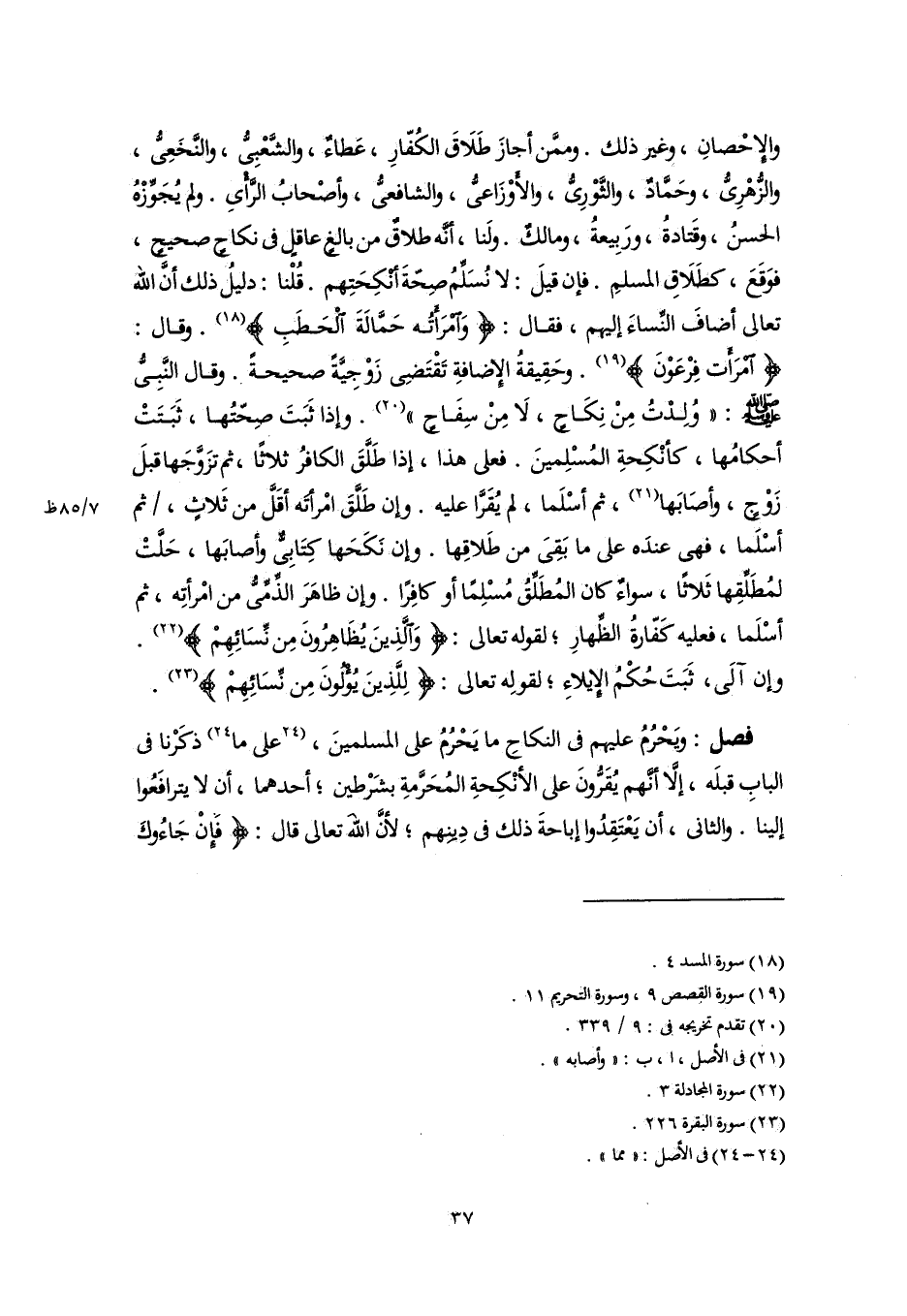 والإِحْصانِ، وغير ذلك. وممَّن أجازَ طَلَاقَ الكُفّارِ، عَطاءٌ، والشَّعْبِىُّ، والنَّخَعِىُّ، والزُّهْرِىُّ، وحَمَّادٌ، والثَّوْرِىُّ، والأوْزَاعىُّ، والشَّافعىُّ، وأصْحابُ الرَّأْىِ. ولم يُجَوِّزْهُ الحسنُ، وقَتَادةُ، ورَبِيعةُ، ومالكٌ. ولَنا، أنَّه طلاقٌ من بالغٍ عاقلٍ فى نكاحٍ صحيحٍ، فوَقَعَ، كطَلَاقِ المسلمِ. فإن قيلَ: لا نُسَلِّمُ صِحَّةَ أَنْكِحَتِهم. قُلْنا: دليلُ ذلك أَنَّ اللَّه تعالى أضافَ النِّساءَ إليهم، فقال: {وَامْرَأَتُهُ حَمَّالَةَ الْحَطَبِ} (١٨). وقال: {امْرَأَتُ فِرْعَوْنَ} (١٩). وحَقِيقةُ الإِضافةِ تَقْتَضِى زَوْجِيَّةً صحيحةً. وقال النَّبِىُّ -صلى اللَّه عليه وسلم-: "وُلِدْتُ مِنْ نِكَاحٍ، لَا مِنْ سِفَاحٍ" (٢٠). وإذا ثَبَتَ صِحَّتُها، ثَبَتَتْ أحكامُها، كأنْكِحةِ المُسْلِمينَ. فعلى هذا، إذا طَلَّقَ الكافرُ ثلاثًا، ثمَّ تزَوَّجَها قبلَ زَوْجٍ، وأصَابَها (٢١)، ثمَّ أسْلَما، لم يُقَرَّا عليه. وإن طَلَّقَ امْرأَتَه أقَلَّ من ثَلاثٍ، ثمَّ أسْلَما، فهى عندَه على ما بَقِىَ من طَلاقِها. رإن نَكَحَها كِتَابِىٌّ وأصابَها، حَلَّتْ لمُطَلِّقِها ثَلاثًا، سواءٌ كان المُطَلِّقُ مُسْلِمًا أو كافِرًا. وإن ظاهَرَ الذِّمِّىُّ من امْرأتِه، ثمَّ أسْلَما، فعليه كَفَّارةُ الظِّهارِ؛ لقوله تعالى: {وَالَّذِينَ يُظَاهِرُونَ مِنْ نِسَائِهِمْ} (٢٢). وإن آلَى، ثَبَتَ حُكْمُ الإيلاءِ؛ لقولِه تعالى: {لِلَّذِينَ يُؤْلُونَ مِنْ نِسَائِهِمْ} (٢٣).