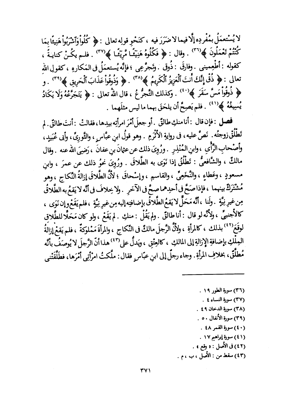 فصل: فإن قال: أنا منكِ طالقٌ. أو جعلَ أمْرَ امرأتِه بيدِها، فقالتْ: أنتَ طالقٌ. لم تَطْلُقْ زوجتُه. نَصَّ عليه، فى روايةِ الأثْرَمِ. وهو قولُ ابنِ عبَّاسٍ، والثَّورِىِّ، وأبى عُبَيدٍ، وأصْحابِ الرَّأْىِ، وابنِ المُنْذِرِ. ورُوِىَ ذلك عن عثمانَ بنِ عفان، رَضِىَ اللَّهُ عنه. وقال مالكٌ، والشَّافعىُّ: تَطْلُقُ إذا نَوَى به الطَّلاقَ. ورُوِىَ نحوُ ذلك عن عمرَ، وابنِ مسعودٍ، وعَطاءٍ، والنَّخَعِىِّ، والقاسمِ، وإسْحاقَ؛ لأنَّ الطَّلاقَ إزالةُ النِّكاحِ، وهو مُشْتَرَكٌ بينهما، فإذا صَحَّ فى أحدِهما صحَّ فى الآخَرِ. ولا خِلافَ فى أنَّه لا يَقعُ به الطَّلاقُ مِن غيرِ نِيَّةٍ. ولَنا، أنَّه مَحَلٌّ لا يَقعُ الطَّلاقُ بإِضافتِه إليه مِن غيرِ نِيَّةٍ، فلم يَقَعْ وإن نَوَى، كالأجنبىِّ، ولأنه لو قال: أنا طالقٌ. ولم يَقُلْ: منكِ. لم يَقَعْ، ولو كان مَحَلًّا للطَّلاقِ لوقَعَ (٤٢) بذلك، كالمرأةِ، ولأنَّ الرَّجلَ مالكٌ فى النِّكاحِ، والمرأةَ مَمْلوكةٌ، فلم يَقعْ إزالةُ المِلْكِ بإضافةِ الإزالةِ إلى المالكِ، كالعِتْقِ، ويَدلُّ على (٤٣) هذا أن الرَّجل لا يُوصَفُ بأنَّه مُطلَّقٌ، بخلافِ المرأةِ. وجاء رجلٌ إلى ابنِ عبّاس فقال: ملَّكتُ امرْأتِى أمْرَها، فطَلَّقَتْنى