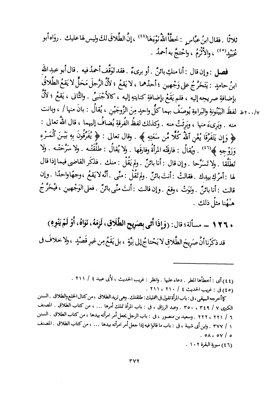 ثلاثًا. فقال ابنُ عبَّاسٍ: خَطَّأَ اللَّهُ نَوْءَهَا (٤٤)، إنَّ الطَّلاقَ لكَ وليس لها عليك. روَاه أبو عُبَيْدٍ (٤٥)، والأَثْرَمُ، واحْتجَّ به أحمدُ.