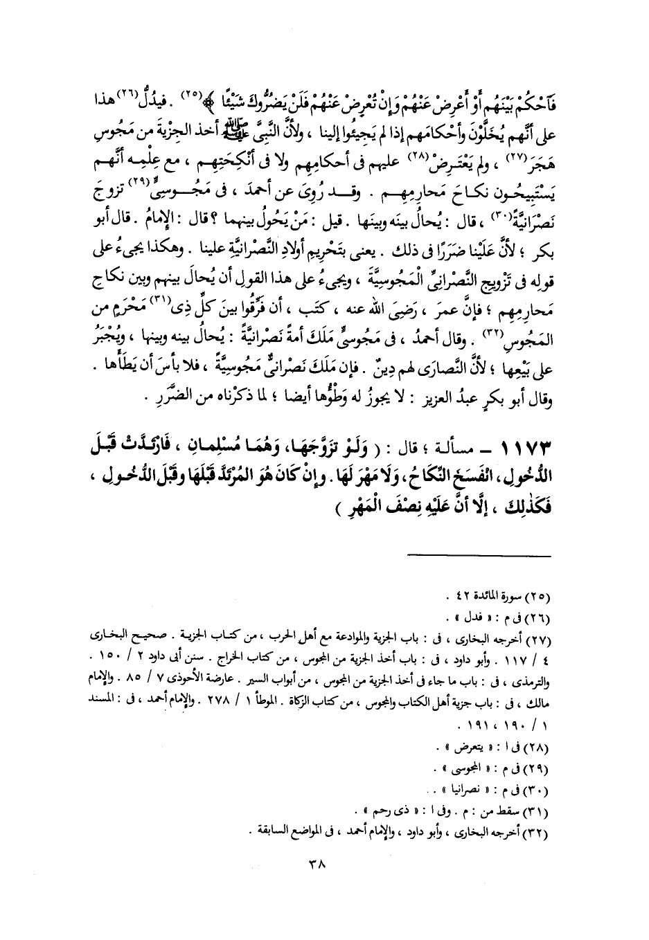 فَاحْكُمْ بَيْنَهُمْ أَوْ أَعْرِضْ عَنْهُمْ وَإِنْ تُعْرِضْ عَنْهُمْ فَلَنْ يَضُرُّوكَ شَيْئًا} (٢٥). فيدُلُّ (٢٦) هذا على أنَّهم يُخَلُّوْنَ وأحْكامَهم إذا لم يَجِيئُوا إلينا، ولأنَّ النَّبِىَّ -صلى اللَّه عليه وسلم- أخذ الجِزْيةَ من مَجُوسِ هَجَرَ (٢٧)، ولم يَعْتَرِضْ (٢٨) عليهم فى أحكامِهِم ولا فى أَنْكِحَتِهِم، مع عِلْمِه أَنَّهم يَسْتَبِيحُون نكاحَ مَحارِمِهِم. وقد رُوِىَ عن أحمدَ، فى مَجُوسِىٍّ (٢٩) تزوجَ نَصْرَانِيَّةً (٣٠)، قال: يُحالُ بينَه وبينَها. قيل: مَنْ يَحُولُ بينهما؟ قال: الإِمَامُ. قال أبو بكر؛ لأنَّ عَلَيْنا ضَرَرًا فى ذلك. يعنى بتَحْرِيمِ أولادِ النَّصْرانيَّةِ علينا. وهكذا يجىءُ على قولِه فى تَزْويِجِ النَّصْرانِىِّ الْمَجُوسِيَّةَ، ويجىءُ على هذا القولِ أن يُحالَ بينهم وبين نكاحِ مَحارِمِهِم، فإنَّ عمرَ، رَضِىَ اللَّهُ عنه، كتَب، أن فَرِّقُوا بينَ كلِّ ذِى (٣١) مَحْرَمٍ من المَجُوسِ (٣٢). وقال أحمدُ، فى مَجُوسِىٍّ مَلَكَ أمةً نَصْرَانِيَّةً: يُحالُ بينه وبينها، ويُجْبَرُ على بَيْعِها؛ لأنَّ النَّصارَى لهم دِينٌ. فإنَّ مَلَكَ نَصْرانِىٌّ مَجُوسِيَّةً، فلا بأسَ أن يَطَأَها. وقال أبو بكرٍ عبدُ العزيز: لا يجوزُ له وَطْؤُها أيضًا؛ لما ذكرْناه من الضَّرَرِ.