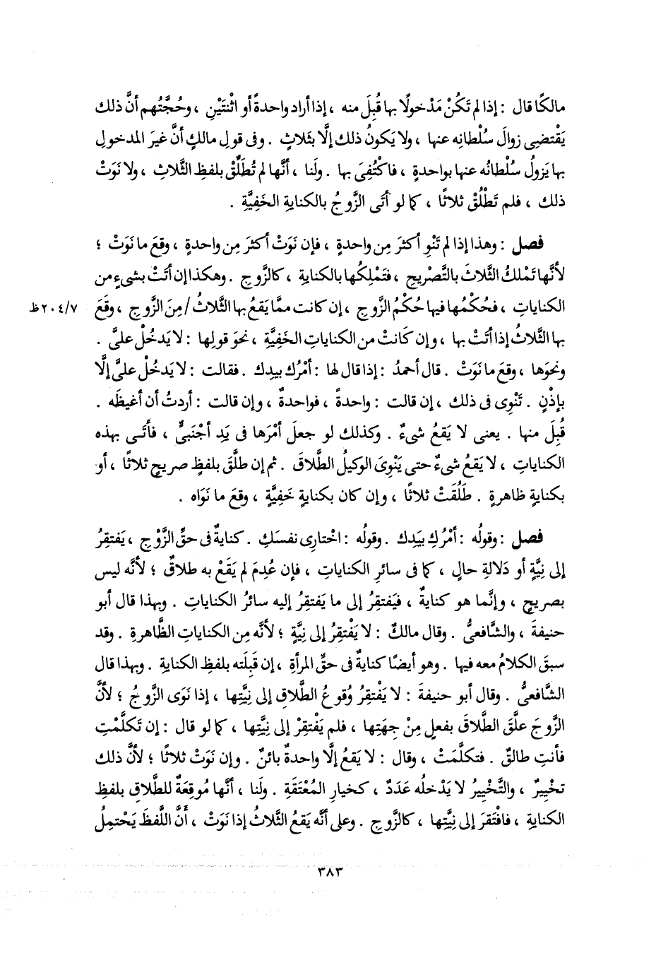 فصل: وقولُه: أمْرُكِ بيَدِك. وقولُه: اخْتارِى نفسَكِ. كنايةٌ فى حقِّ الزَّوْجِ، يَفتقِرُ إلى نِيَّةٍ أو دَلالةِ حالٍ، كما فى سائرِ الكناياتِ، فإن عُدِمَ لم يَقَعْ به طلاقٌ؛ لأنَّه ليس بصريحٍ، وإنَّما هو كنايةٌ، فيَفتقِرُ إلى ما يَفتقِرُ إليه سائرُ الكناياتِ. وبهذا قال أبو حنيفةَ، والشَّافعىُّ. وقال مالكٌ: لا يفتقِرُ إلى نِيَّةٍ؛ لأنَّه مِن الكناياتِ الظَّاهرةِ. وقد سبقَ الكلامُ معه فيها. وهو أيضًا كنايةٌ فى حقِّ المرأةِ، إن قَبِلَته بلفظِ الكنايةِ. وبهذا قال الشَّافعىُّ. وقال أبو حنيفةَ: لا يَفْتقِرُ وُقوعُ الطَّلاقِ إلى نِيَّتِها، إذا نَوَى الزَّوجُ؛ لأنَّ الزَّوجَ علَّقَ الطَّلاقَ بفعلٍ مِنْ جِهَتِها، فلم يَفْتقِرْ إلى نِيَّتِها، كما لو قال: إن تَكلَّمْتِ فأنتِ طالقٌ. فتكلَّمَتْ، وقال: لا يَقعُ إلَّا واحدةٌ بائنٌ. وإن نَوَتْ ثلاثًا؛ لأنَّ ذلك تخْيِيرٌ، والتَّخْيِيرُ لا يَدْخلُه عَدَدٌ، كخيارِ المُعْتَقَةِ. ولَنا، أنَّها مُوقِعَةٌ للطَّلاقِ بلفظِ الكنايةِ، فافْتَقرَ إلى نِيَّتِها، كالزَّوجِ. وعلى أنَّه يَقعُ الثَّلاثُ إذا نَوَتْ، أَنَّ اللَّفظَ يَحْتمِلُ