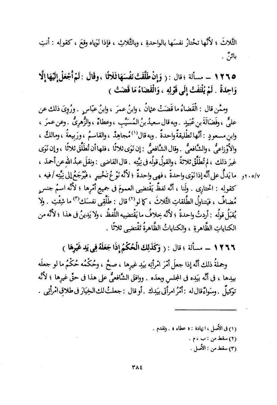 وممَّن قال: الْقَضاءُ ما قَضَتْ عثمانُ، وابنُ عمرَ، وابنُ عبَّاسٍ. ورُوِىَ ذلك عن علىٍّ، وفَضَالَةَ بنِ عُبَيدٍ. وبه قال سعيدُ بنُ المُسَيَّبِ، وعطاءٌ، والزُّهرِىُّ. وعن عمرَ، وابنِ مسعودٍ: أنَّها تَطْليقةٌ واحدةٌ. وبه قال (١) مُجاهِدٌ، والقاسمُ، ورَبِيعةُ، ومالكٌ، والأوْزاعىُّ، والشَّافعىُّ. وقال الشَّافعىُّ: إن نَوَى ثلاثًا، فلها أن تُطَلِّقَ ثلاثًا، وإن نَوَى غيرَ ذلك، لم تُطَلِّقْ ثلاثةً، والقولُ قولُه فى نِيَّتِه. قال القاضى: ونقلَ عبدُ اللَّهِ عن أحمدَ، ما يَدلُّ على أنَّه إذا نَوَى واحدةً، فهى واحدةٌ؛ لأنَّه نَوْعُ تخييرٍ، فيُرْجَعُ إلى نِيَّتِه فيه، كقولِه: اخْتارِى. ولَنا، أنَّه لفظٌ يَقْتضِى العمومَ فى جميعِ أمْرِها؛ لأنَّه اسمُ جنسٍ مُضافٌ، فيَتناولُ الطَّلقاتِ الثَّلاثَ، كما لو (٢) قال: طَلِّقِى نفسَك (٣) ما شِئْتِ. ولا يُقبَلُ قولُه: أردتُ واحدةً؛ لأنَّه خِلافُ ما يَقْتضِيه اللَّفظُ، ولا يَدِينُ فى هذا؛ لأنَّه من الكناياتِ الظَّاهرةِ، والكناياتُ الظَّاهرةُ تَقْتضِى ثلاثًا.