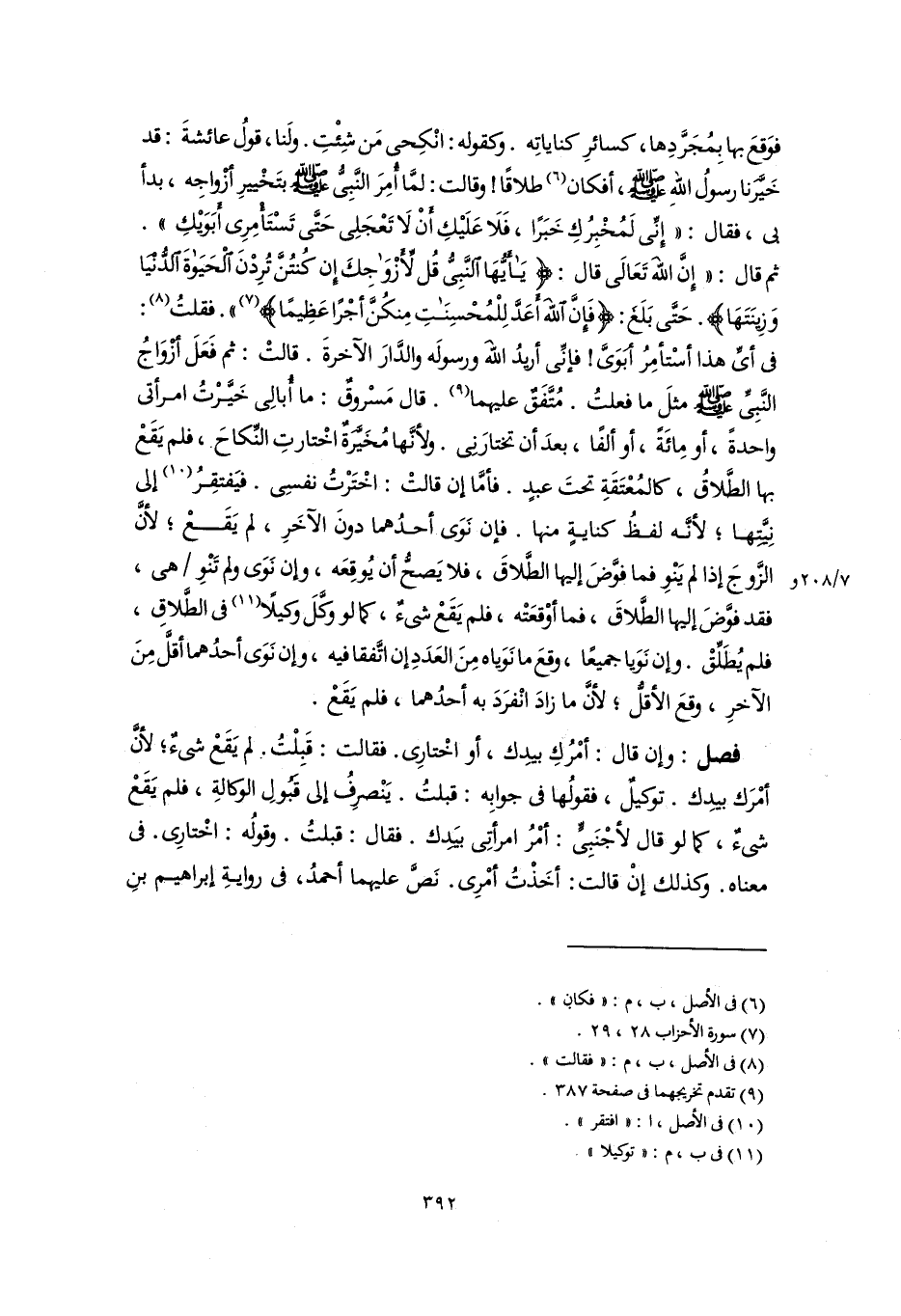 فوَقعَ بها بِمُجَرَّدِها، كسائرِ كناياتِه. كقوله: انْكِحى مَن شِئْتِ. ولَنا، قولُ عائشةَ: قد خَيَّرَنا رسولُ اللَّه -صلى اللَّه عليه وسلم-، أفكان (٦) طلاقًا! وقالت: لمَّا أُمِرَ النَّبِىُّ -صلى اللَّه عليه وسلم- بتَخْييرِ أزْواجِه، بدأ بى، فقال: "إنِّى لَمُخْبِرُكِ خَبَرًا، فَلَا عَلَيْكِ أَنْ لَا تَعْجَلِى حَتَّى تَسْتَأْمِرِى أَبَوَيْكِ". ثم قال: "إنَّ اللَّهَ تَعَالَى قال: {يَاأَيُّهَا النَّبِىُّ قُلْ لِأَزْوَاجِكَ إِنْ كُنْتُنَّ تُرِدْنَ الْحَيَاةَ الدُّنْيَا وَزِينَتَهَا}. حَتَّى بَلَغ: {فَإِنَّ اللَّهَ أَعَدَّ لِلْمُحْسِنَاتِ مِنْكُنَّ أَجْرًا عَظِيمًا} (٧) ". فقلتُ (٨): فى أىِّ هذا أسْتأمِرُ أُبَوَىَّ! فإنِّى أريدُ اللَّه ورسولَه والدَّارَ الآخرةَ. قالتْ: ثم فَعَلَ أزْوَاجُ النَّبِىِّ -صلى اللَّه عليه وسلم- مثلَ ما فعلتُ. مُتَّفَقٌ عليهما (٩). قال مَسْروقٌ: ما أُبالِى خَيَّرْتُ امرأتى واحدةً، أو مِائَةً، أو ألفًا، بعدَ أن تختارَنِى. ولأنَّها مُخَيَّرَةٌ اخْتارتِ النِّكاحَ، فلم يَقَعْ بها الطَّلاقُ، كالمُعْتَقَةِ تحتَ عبدٍ. فأمَّا إن قالتْ: اخْتَرْتُ نفسِى. فيَفتقِرُ (١٠) إلى نِيَّتِها؛ لأنَّه لفظُ كنايةٍ منها. فإن نَوَى أحدُهما دونَ الآخَرِ، لم يَقَعْ؛ لأنَّ الزَّوجَ إذا لم يَنْوِ فما فوَّضَ إليها الطَّلاقَ، فلا يَصحُّ أن يُوقِعَه، وإن نَوَى ولم تَنْوِ هى، فقد فوَّضَ إليها الطَّلاقَ، فما أوْقعَتْه، فلم يَقَعْ شىءٌ، كما لو وكَّلَ وكيلًا (١١) فى الطَّلاقِ، فلم يُطَلِّقْ. وإن نَوَيا جميعًا، وقعَ ما نَوَياه مِنَ العَدَدِ إن اتَّفقا فيه، وإن نَوَى أحدُهما أقلَّ مِنَ الآخرِ، وقعَ الأقلُّ؛ لأنَّ ما زادَ انْفرَدَ به أحدُهما، فلم يَقَعْ.