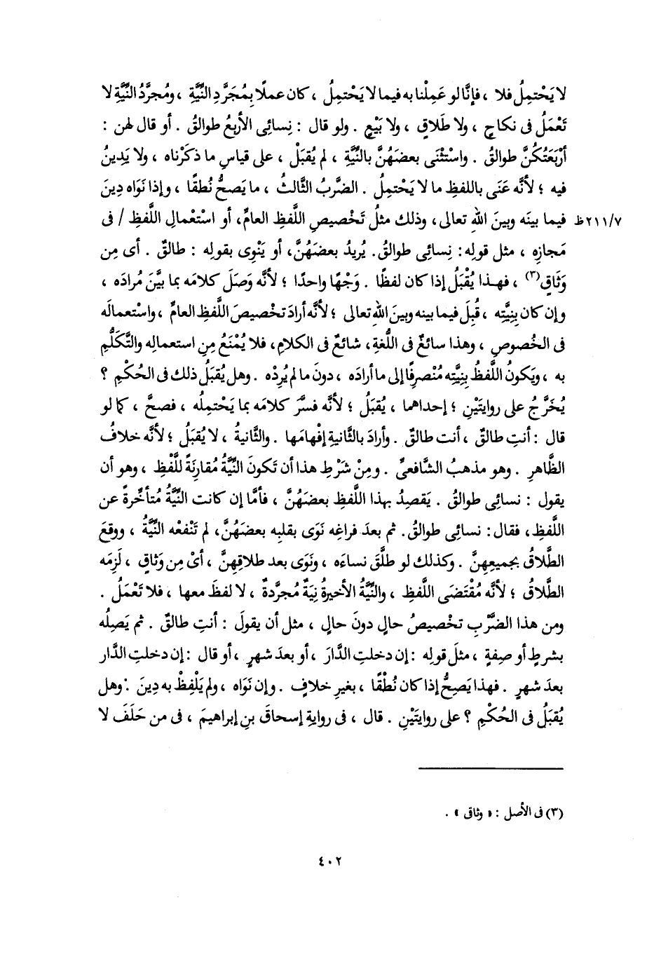 لا يَحْتمِلُ فلا، فإنَّا لو عَمِلْنا به فيما لا يَحْتمِلُ، كان عملًا بِمُجَرَّدِ النِّيَّةِ، ومُجرَّدُ النِّيَّةِ لا تَعْمَلُ فى نكاحٍ، ولا طَلاقٍ، ولا بَيْعٍ. ولو قال: نِسائِى الأربعُ طوالقُ. أو قال لهن: أربَعَتُكُنَّ طوالقُ. واسْتثْنَى بعضَهُنَّ بالنِّيَّةِ، لم يُقبَلْ، على قياسِ ما ذكَرْناه، ولا يَدِينُ فيه؛ لأنَّه عَنَى باللفظِ ما لا يَحْتمِلُ. الضَّربُ الثالثُ، ما يَصحُّ نُطقًا، وإذا نَوَاه دِينَ فيما بينَه وبينَ اللَّهِ تعالى، وذلك مثلُ تَخْصيص اللَّفظِ العامِّ، أو اسْتعْمالِ اللَّفظِ فى مَجازِه، مثل قولِه: نِسائِى طوالقُ. يُريدُ بعضَهُنَّ، أو يَنْوِى بقولِه: طالقٌ. أى مِن وَثَاقٍ (٣)، فهذا يُقْبَلُ إذا كان لفظًا. وَجْهًا واحدًا؛ لأنَّه وَصَلَ كلامَه بما بيَّنَ مُرادَه، وإن كان بِنِيَّتِه، قُبِلَ فيما بينه وبينَ اللَّهِ تعالى؛ لأنَّه أرادَ تخْصيصَ اللَّفظِ العامِّ، واسْتعمالَه فى الخُصوصِ، وهذا سائغٌ فى اللُّغةِ، شائعٌ فى الكلام، فلا يُمْنَعُ مِنِ استعمالِه والتَّكَلُّمِ به، ويَكونُ اللَّفظُ بِنِيَّتِهِ مُنْصرِفًا إلى ما أرادَه، دونَ ما لم يُرِدْه. وهل يُقبَلُ ذلك فى الحُكْمِ؟ يُخَرجُ على روايتَيْنِ؛ إحداهما، يُقبَلُ؛ لأنَّه فسَّرَ كلامَه بما يَحْتمِلُه، فصحَّ، كما لو قال: أنتِ طالقٌ، أنت طالقٌ. وأرادَ بالثَّانيةِ إفْهامَها. والثَّانيةُ، لا يُقبَلُ؛ لأنَّه خلافُ الظَّاهرِ. وهو مذهبُ الشَّافعىِّ. ومِنْ شَرْطِ هذا أن تَكونَ النِّيَّةُ مُقارَنةً للَّفْظِ، وهو أن يقول: نسائِى طوالقُ. يَقصِدُ بهذا اللفظِ بعضَهُنَّ، فأمَّا إن كانت النِّيَّةُ مُتأخِّرةً عن اللَّفظِ، فقال: نسائِى طوالقُ. ثم بعدَ فراغِه نَوَى بقلبِه بعضَهُنَّ، لم تَنْفعْه النِّيَّةُ، ووقعَ الطَّلاقُ بجميعِهِنَّ. وكذلك لو طلَّقَ نساءَه، وَنوى بعد طلاقِهِنَّ، أىْ مِن وَثاقٍ، لَزِمَه الطَّلاقُ؛ لأنَّه مُقْتَضَى اللَّفظِ، والنِّيَّةُ الأخيرةُ نِيَةٌ مُجرَّدةٌ، لا لفظَ معها، فلا تَعْمَلُ. ومن هذا الضَّرْبِ تخْصيصُ حالٍ دونَ حالٍ، مثل أن يقولَ: أنتِ طالقٌ. ثم يَصِلُه بشرطٍ أو صِفةٍ، مثلَ قولِه: إن دخلتِ الدَّارَ، أو بعدَ شهرٍ، أو قال: إن دخلتِ الدَّار بعدَ شهرٍ. فهذا يَصِحُّ إذا كان نُطْقًا، بغيرِ خلافٍ. وإن نَوَاه، ولم يَلْفِظْ به دِينَ: وهل يُقبَلُ فى الحُكْمِ؟ على روايتَيْنِ. قال، فى روايةِ إسحاقَ بنِ إبراهيمَ، فى من حَلَفَ لا