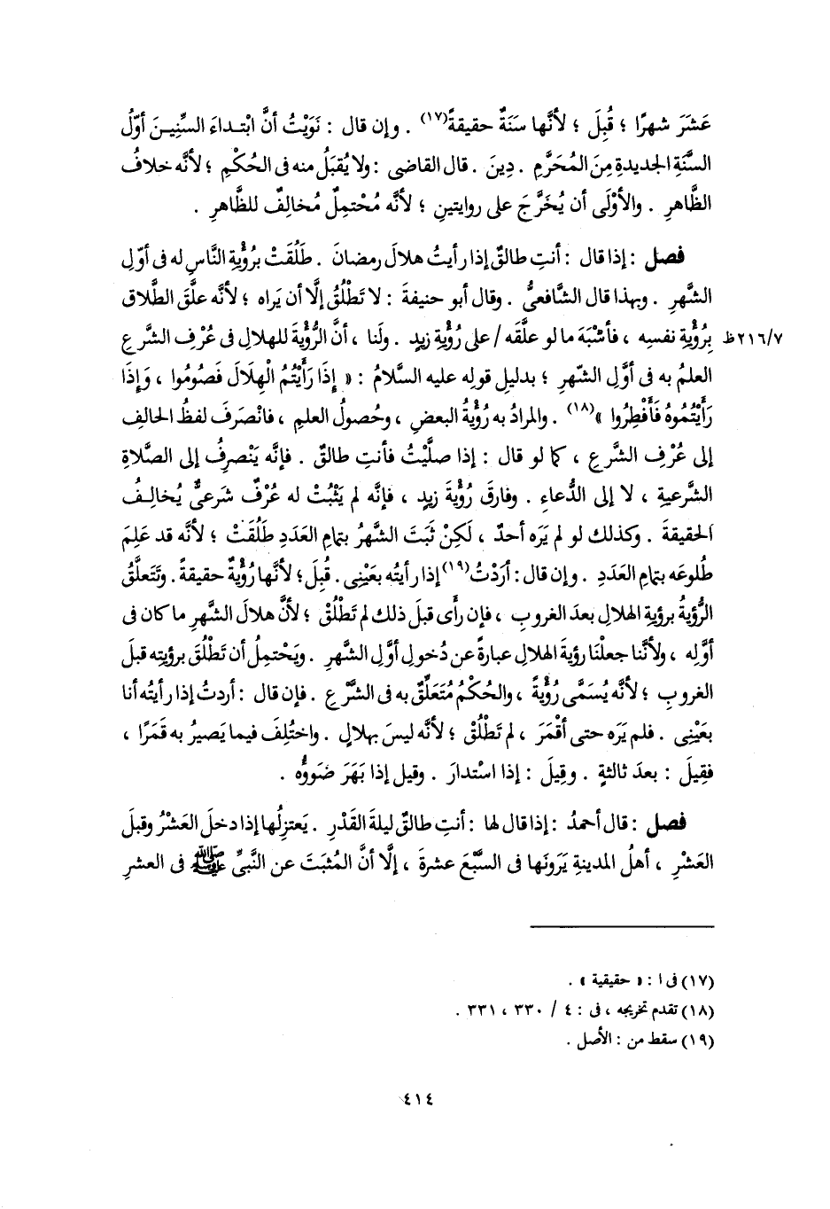 فصل: إذا قال: أنتِ طالقٌ إذا رأيتُ هلالَ رمضانَ. طَلُقَتْ برُؤْيةِ النَّاس له فى أوّلِ الشَّهرِ. وبهذا قال الشَّافعىُّ. وقال أبو حنيفةَ: لا تَطْلُقُ إلَّا أن يَراه؛ لأنَّه علَّقَ الطَّلاق بِرُؤْيةِ نفسِه، فأشْبَهَ ما لو علَّقَه على رُؤْيةِ زيدٍ. ولَنا، أَنَّ الرُّؤْيةَ للهلالِ فى عُرْفِ الشَّرعِ العلمُ به فى أوَّلِ الشَّهرِ؛ بدليلِ قولِه عليه السَّلامُ: "إِذَا رَأَيْتُمُ الْهِلَالَ فَصُومُوا، وَإِذَا رَأَيْتُمُوهُ فَأَفْطِرُوا" (١٨). والمرادُ به رُويةُ البعضِ، وحُصولُ العلمِ، فانْصَرفَ لفظُ الحالفِ إلى عُرْفِ الشَّرعِ، كما لو قال: إذا صلَّيْتُ فأنتِ طالق. فإنَّه يَنْصرِفُ إلى الصَّلاةِ الشَّرعيةِ، لا إلى الدُّعاءِ. وفارقَ رُؤْيةَ زيدٍ، فإنَّه لم يَثْبُتْ له عُرْفٌ شَرعىٌّ يُخالِفُ الحقيقةَ. وكذلك لو لم يَرَه أحدٌ، لَكِنْ ثَبَتَ الشَّهرُ بتمامِ العَدَدِ طَلُقَتْ؛ لأنَّه قد عَلِمَ طُلوعَه بتمامِ العَدَدِ. وإن قال: أرَدْتُ (١٩) إذا رأيتُه بعَيْنِى. قُبِلَ؛ لأنَّها رُؤْيةٌ حقيقةً. وتَتَعلَّقُ الرُّؤيةُ برؤيةِ الهلالِ بعدَ الغروبِ، فإن رأَى قبلَ ذلك لم تَطْلُقْ؛ لأنَّ هلالَ الشَّهرِ ما كان فى أوَّلِه، ولأنَّنا جعلْنَا رؤيةَ الهلالِ عبارةً عن دُخولِ أوَّلِ الشَّهرِ. ويَحْتمِلُ أن تَطْلُقَ برؤيتِه قبلَ الغروبِ؛ لأنَّه يُسَمَّى رُؤيةً، والحُكْمُ مُتَعَلِّقٌ به فى الشَّرْعِ. فإن قال: أردتُ إذا رأيتُه أنا بعَيْنِى. فلم يَرَه حتى أقْمَرَ، لم تَطْلُقْ؛ لأنَّه ليسَ بهلالٍ. واختُلِفَ فيما يَصيرُ به قَمَرًا، فقِيلَ: بعدَ ثالثةٍ. وقِيلَ: إذا اسْتدارَ. وقيل إذا بَهَرَ ضَوؤُه.