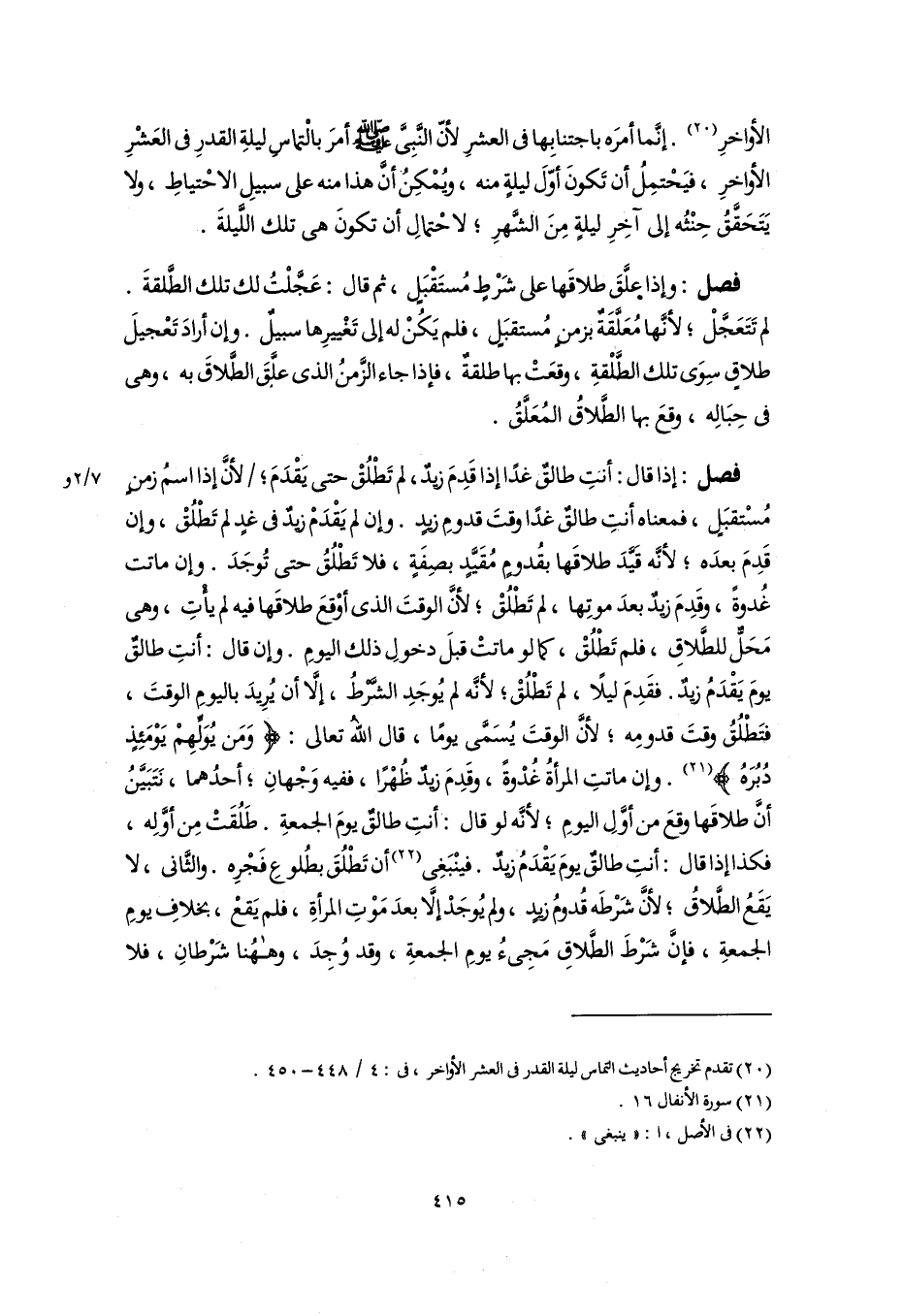 الأواخرِ (٢٠). إنَّما أمرَه باجتنابِها فى العشرِ لأنّ النَّبِىَّ -صلى اللَّه عليه وسلم- أمرَ بالْتماسِ ليلةِ القدرِ فى العَشْرِ الأواخرِ، فيَحْتمِلُ أن تَكونَ أوّلَ ليلةٍ منه، ويُمْكِن أنَّ هذا منه على سبيلِ الاحْتياطِ، ولا يَتَحَقَقُ حِنْثُه إلى آخِرِ ليلةٍ مِنَ الشَّهرِ؛ لاحْتمالِ أن تكونَ هى تلك اللَّيلةَ.